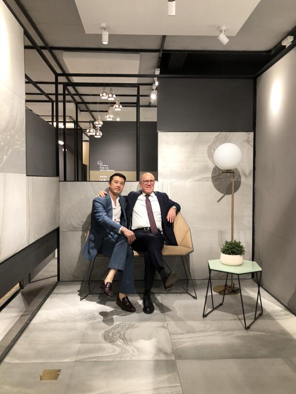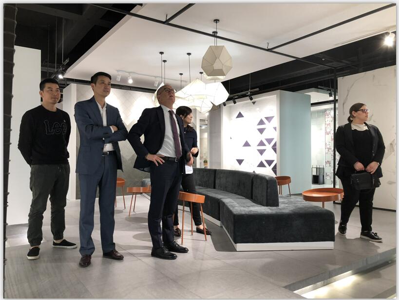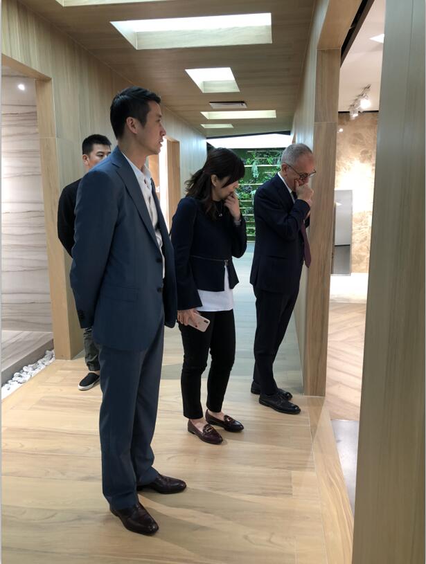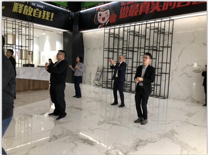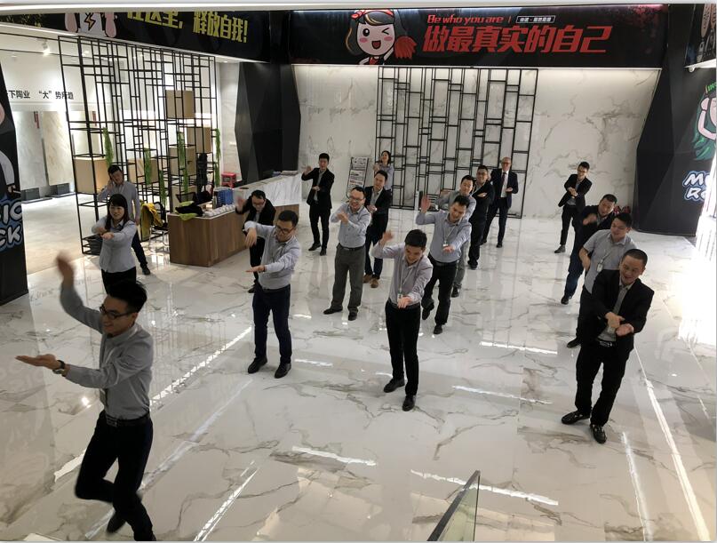 12月7日,依諾瓷磚佛山總部一樓大廳像往常一樣,加盟部的伙伴們正在熱情地跳著舞。這個時候,在隊伍的后面加入了1位外國人,仔細一看,原來是遠道而來的貴賓---意大利設計公司·STYLGRAPH總裁Maurizio先生。