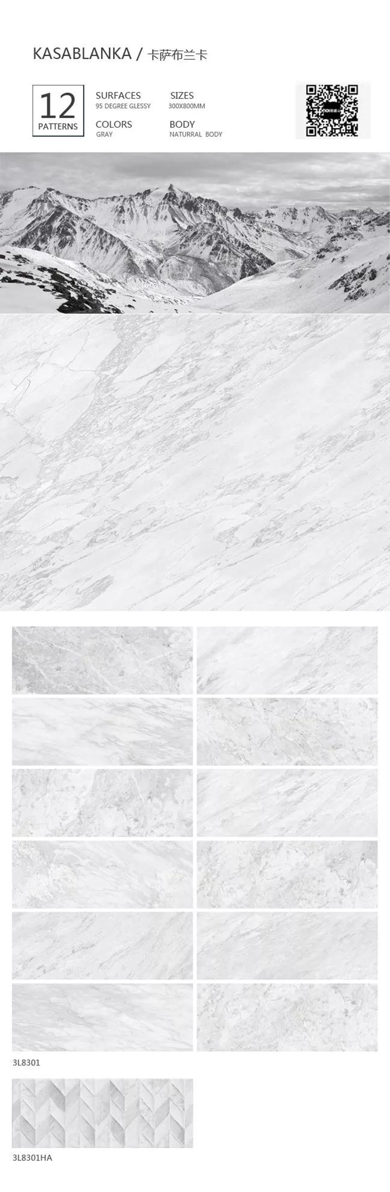 【卡(ka)薩布蘭卡(ka)】系列,色調干凈(jing)優雅,紋理就像高山上的(de)積雪留下風(feng)的(de)足跡(ji),具(ju)有(you)柔美的(de)流動(dong)感。