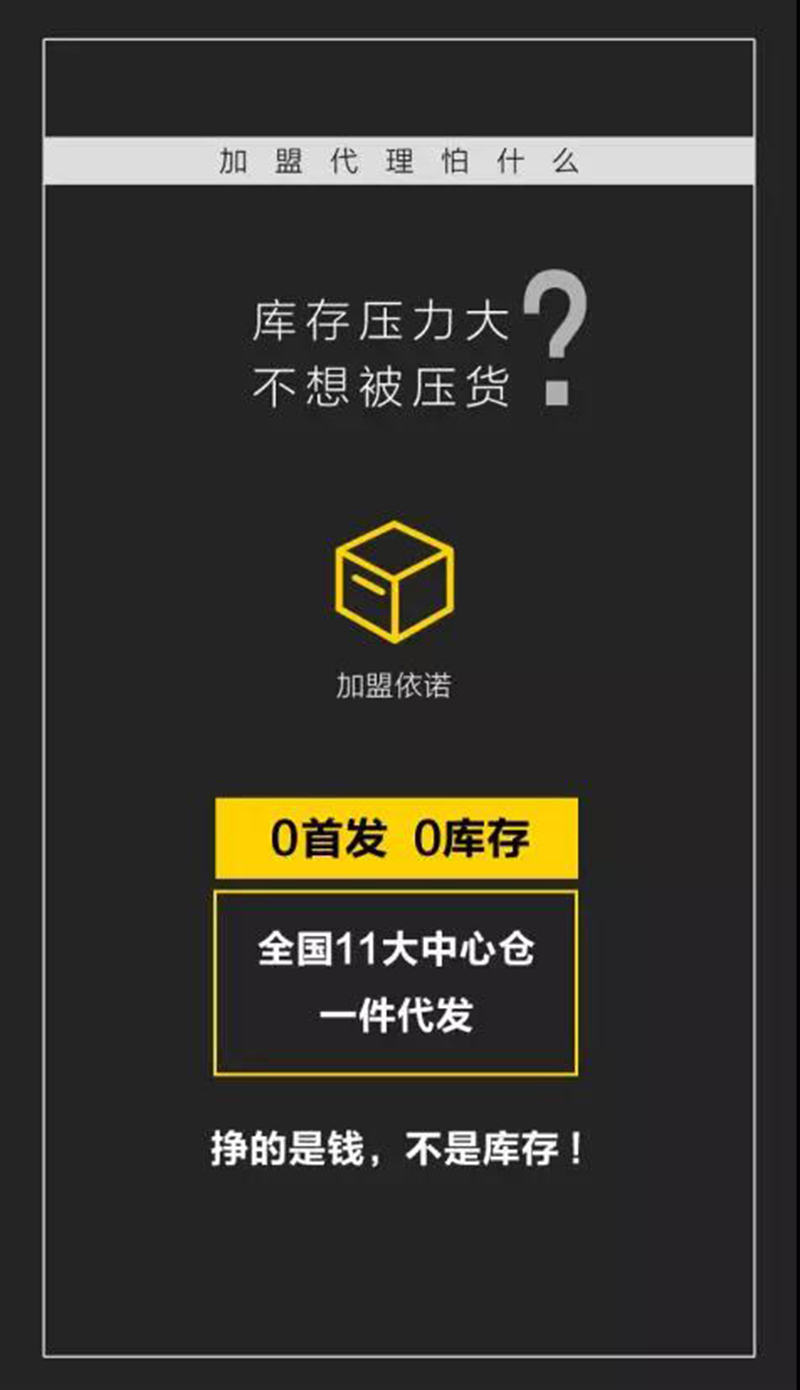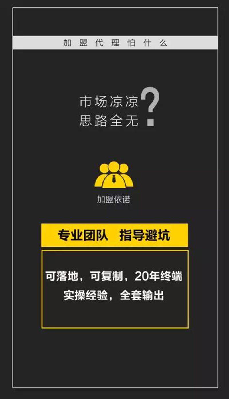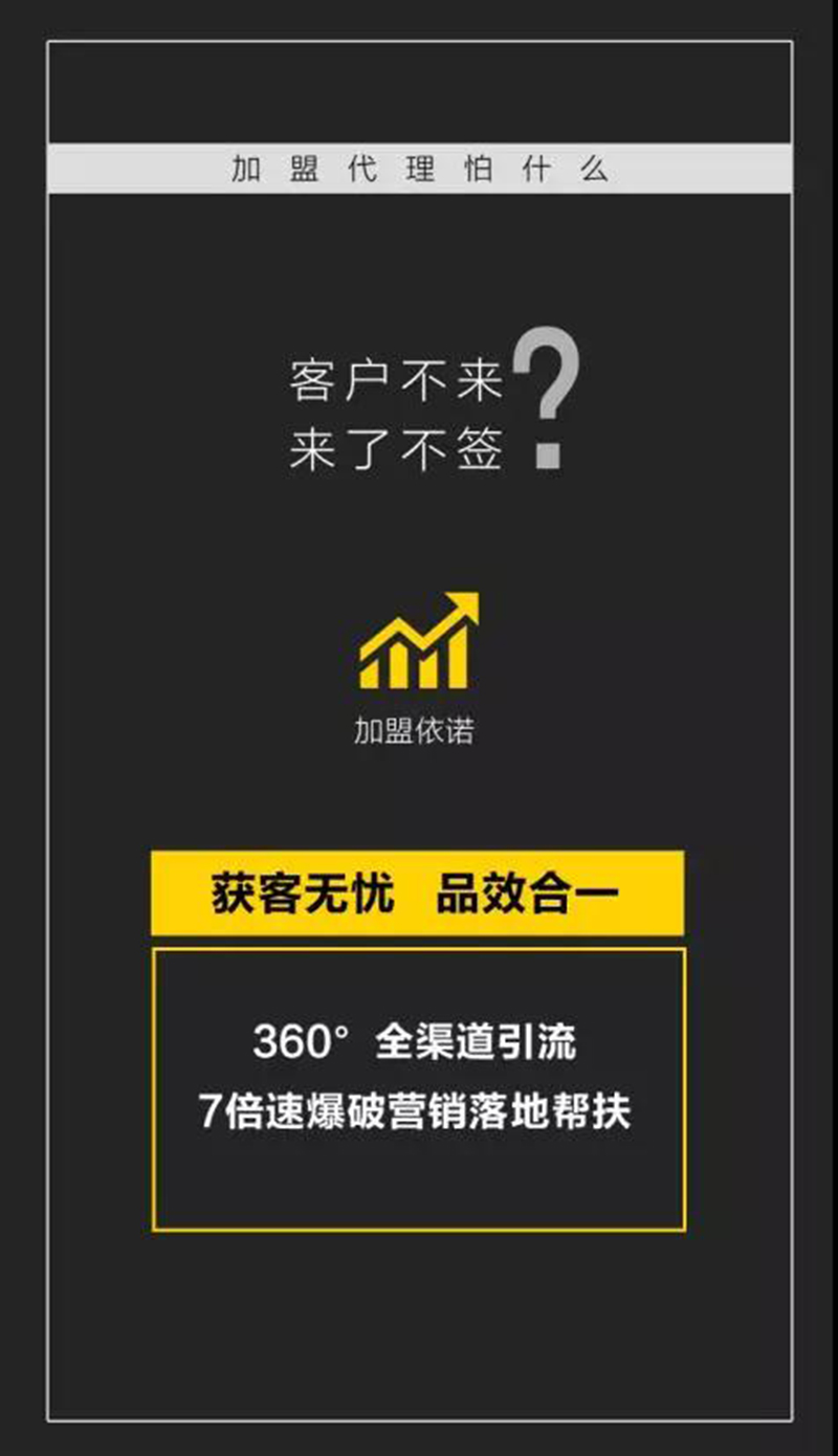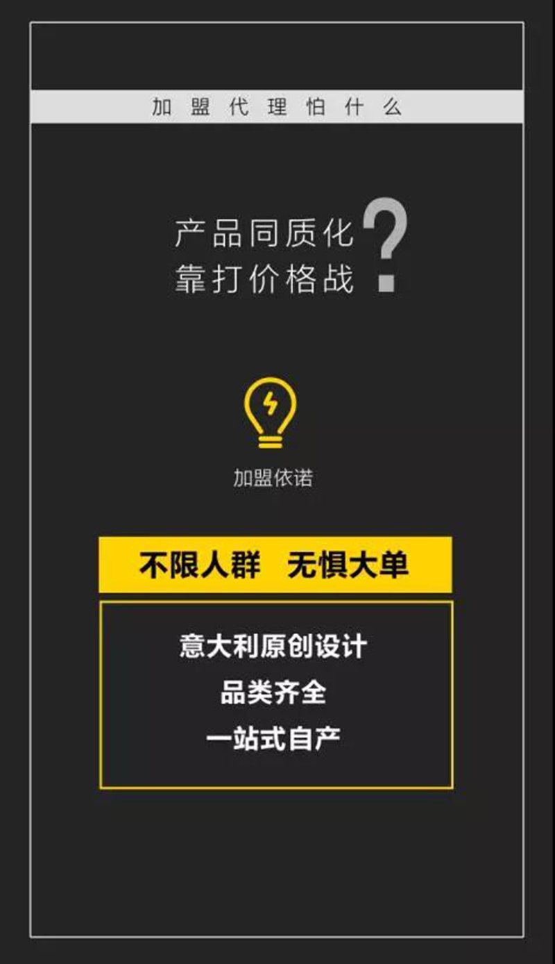 所謂了解,就是知道對方心靈最深處的痛處,痛在哪里?依諾瓷磚生產廠家深知經銷商們在選擇瓷磚加盟一個瓷(ci)磚(zhuan)(zhuan)品牌和經(jing)營店面所承擔的現實壓(ya)力(li),例(li)如:投資風(feng)險(xian)大,裝(zhuang)店成本高;庫存(cun)壓(ya)力(li)大,不想被壓(ya)貨;產(chan)品同質(zhi)化,靠打價格戰;客戶不來,來了不簽…與(yu)(yu)此同時(shi),還要面對(dui)行業負(fu)增長,市(shi)場(chang)寒冬(dong)的沖(chong)擊(ji)!未來風(feng)險(xian)與(yu)(yu)迷茫叢生讓許多有志經(jing)銷商(shang)望而(er)卻(que)步。恰逢(feng)依諾瓷(ci)磚(zhuan)(zhuan)20周年大慶,公司決定投“1億元重金”,為經(jing)銷商(shang)們量身定做一套瓷(ci)磚(zhuan)(zhuan)加盟模式
