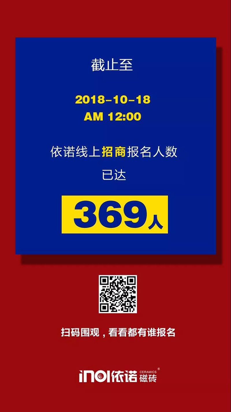 截止10月(yue)18日,中(zhong)午12:00,依諾線上【招商小程序】報(bao)名人數(shu)已達369人,且其中(zhong)超過80%的經銷商已經在陶博會期間前(qian)往依諾(nuo)總(zong)部展廳進行深入洽談。