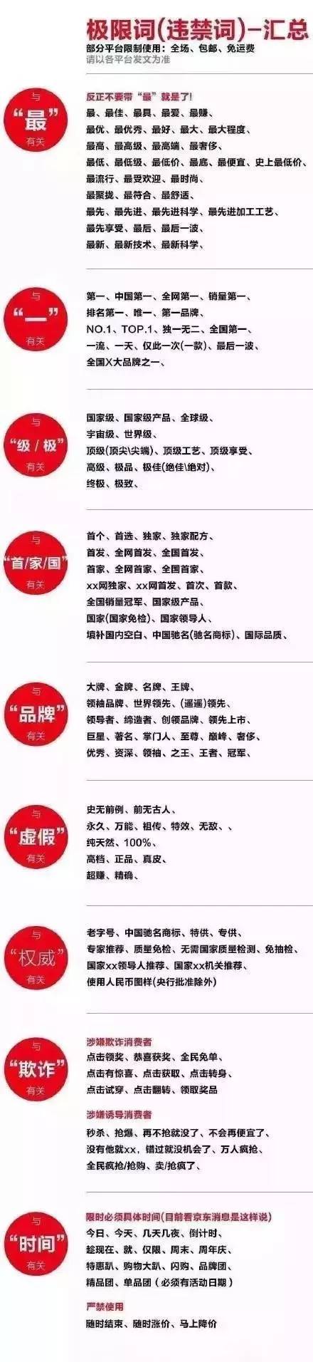 據悉(xi),極限用語包括(kuo)但(dan)不僅限于商品列表(biao)頁、商品的標題(ti),副標題(ti),主圖以(yi)(yi)及(ji)詳(xiang)情頁,商品包裝等。對于極限用語的店(dian)鋪(pu)(pu),一經發現(xian)違規(gui)店(dian)鋪(pu)(pu)將(jiang)給(gei)予扣分并(bing)進(jin)行罰款,處于二十萬元以(yi)(yi)上一百(bai)萬元以(yi)(yi)下的罰款,出現(xian)情節嚴重將(jiang)直接進(jin)行封店(dian)處理。而一旦遇顧(gu)客(ke)投訴(su)極限用語,并(bing)維權成功,賠付金額將(jiang)有商家全部(bu)承擔。所(suo)以(yi)(yi),賣(mai)家們要重視起來(lai),自查(cha)自糾,及(ji)時進(jin)行修正和更改,以(yi)(yi)免被(bei)罰。