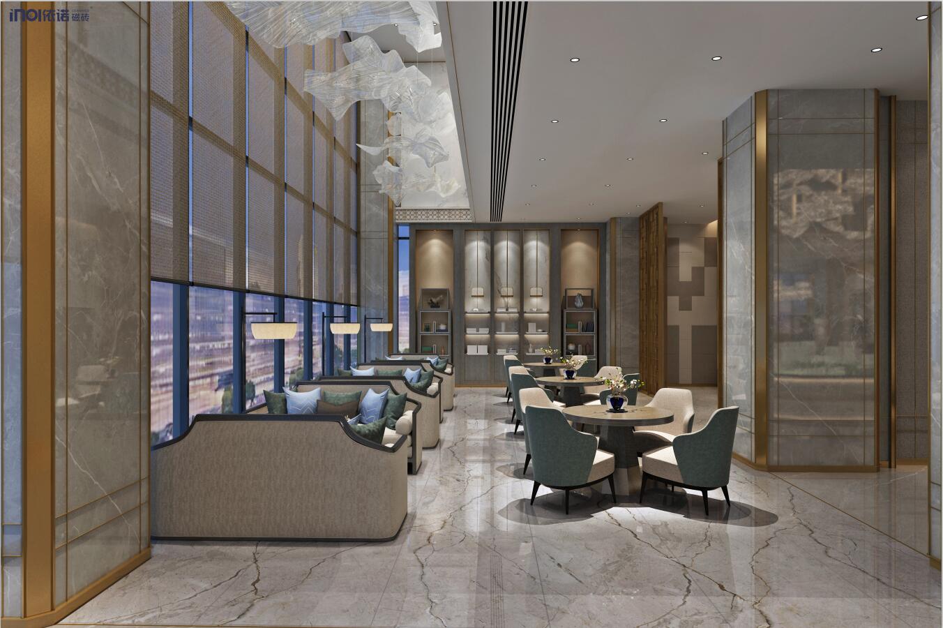 接待區兩側為洽談區,運用中式對稱結構,地面采用依諾大理石瓷磚【連紋大板】歲月鎏金系列,精致的金黃色大理石紋,貴氣流露,恰到好處地詮釋了現代奢華的精髓,打造舒適的暖調空間。