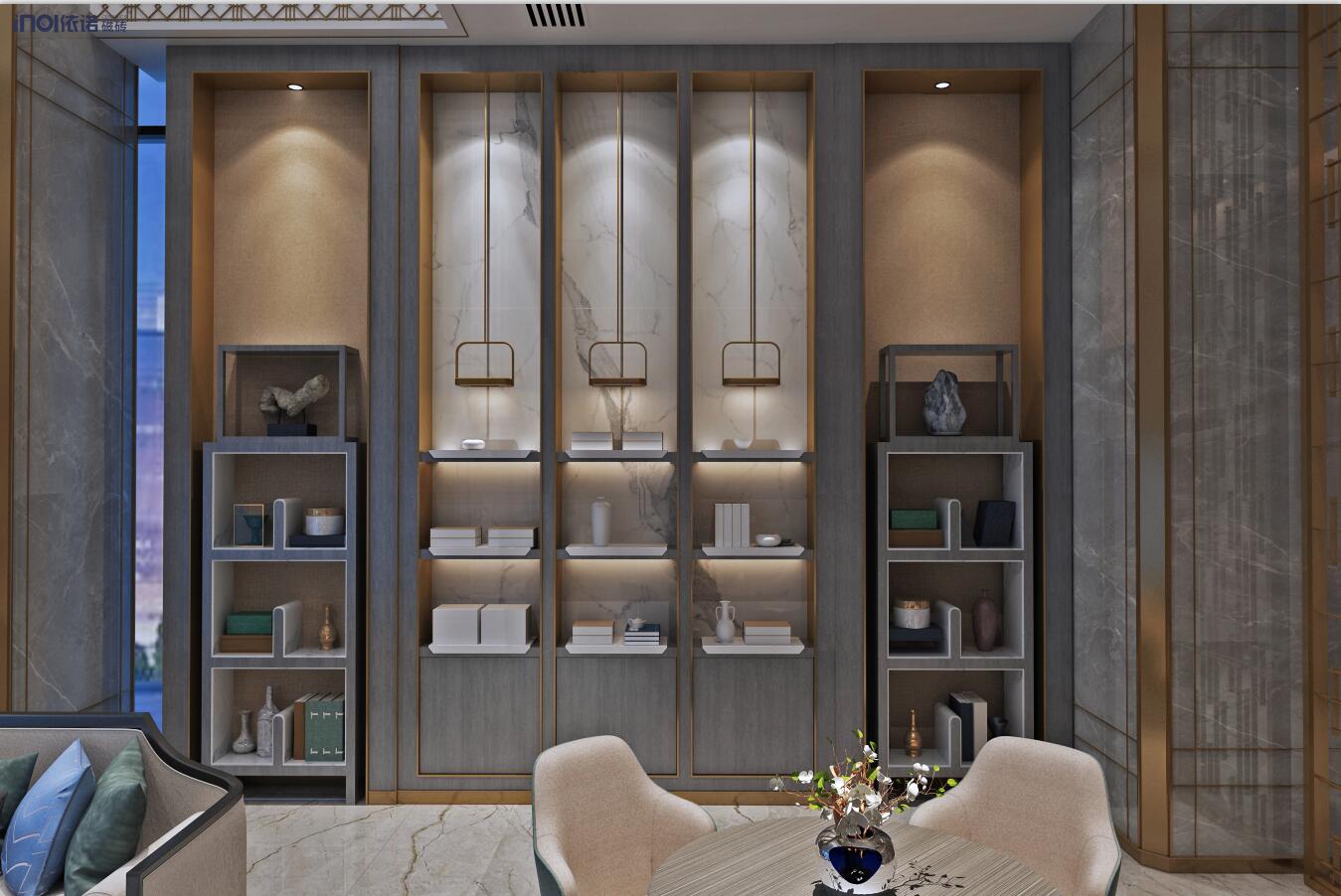 洽談區中獨辟一方為品茶區,設計師取中國傳統符號形態之美,借助現代材料展現開來,典雅祥和,描繪出具有深度的人文氣息,讓來往者瞬間可安靜下來,享受一刻閑暇與安寧。