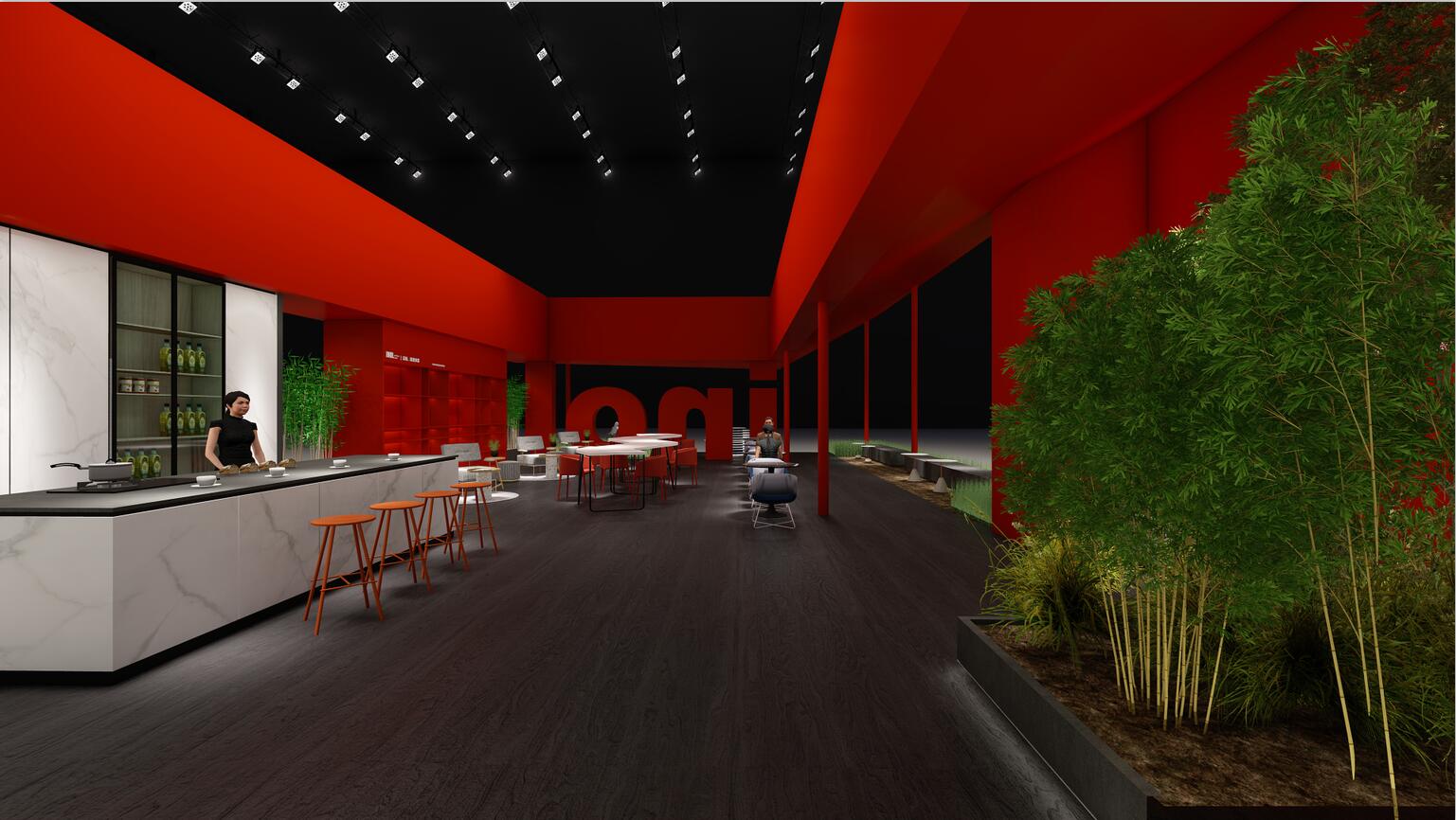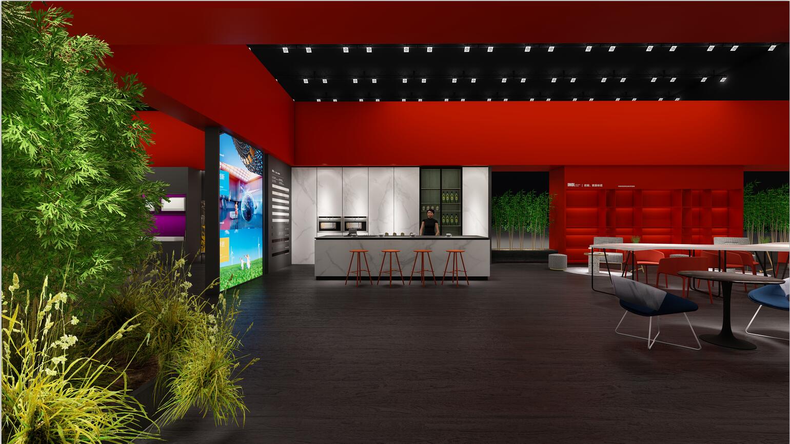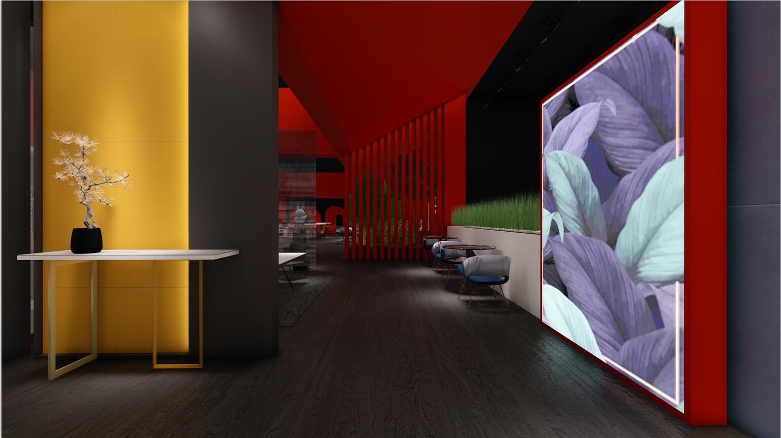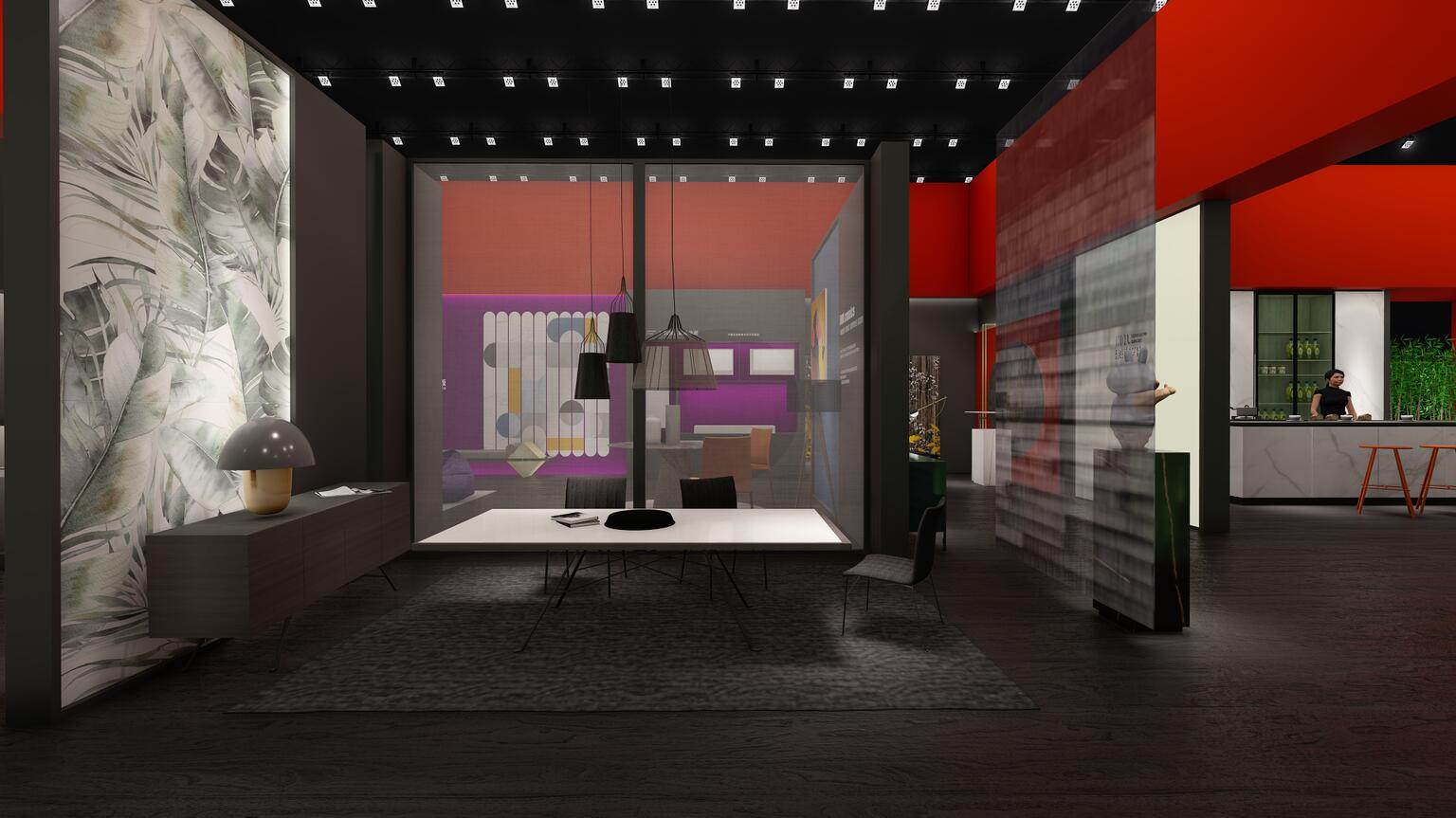依諾瓷磚在本次廣州設計周上主推自主設計、研發與生產的高端巖板產品,因此設計師采用大膽的紅色作為主色調,來體現依諾巖板廠家「新國貨力量(liang)」的主題(ti)。