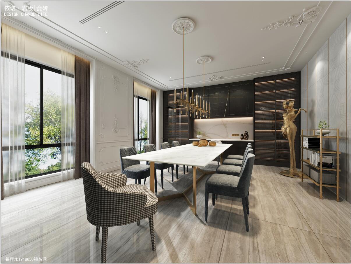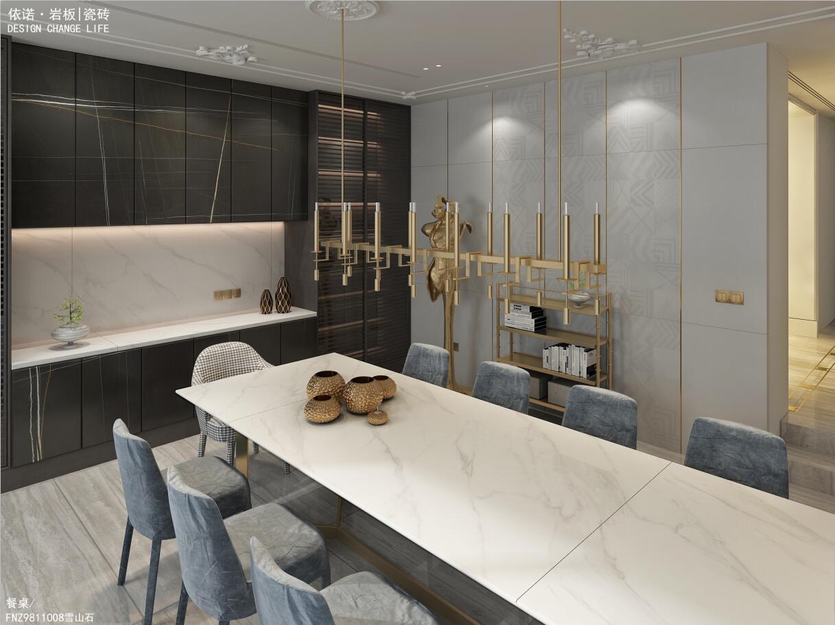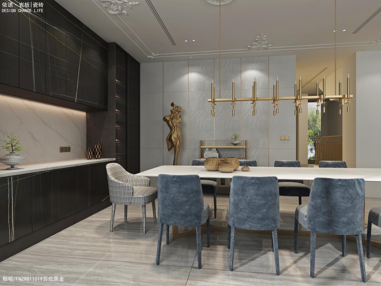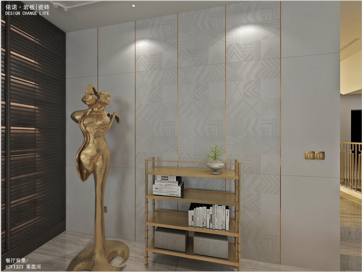 餐廳背景墻運用了依諾瓷磚「萊茵河」系列,帶有幾何暗紋,鑲嵌亮光金屬線,搭配金屬雕塑和架子,讓法式的輕奢感得到多元化的演繹。