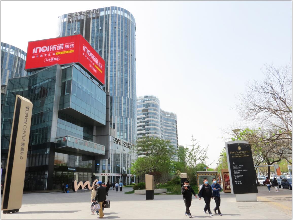 依諾瓷磚品牌全新形(xing)象廣告畫(hua)面正式登(deng)陸北京商務中心地標(biao)性建(jian)筑——三里屯通盈中心LED大屏,以(yi)亮麗“中國(guo)紅”為中國(guo)加油,向大家傳遞中國(guo)智造(zao)的(de)強大力(li)量和信心,吸引了眾多游客的(de)駐足觀看。