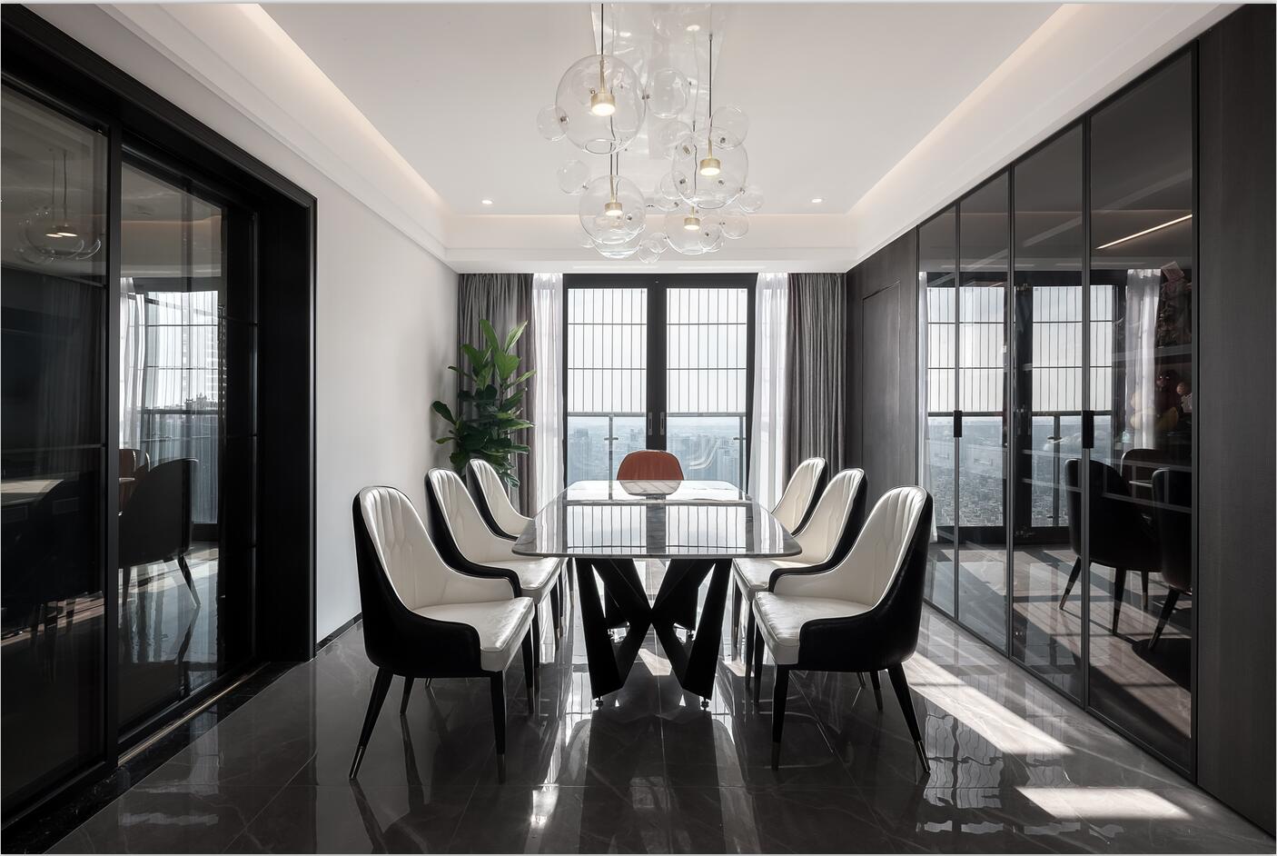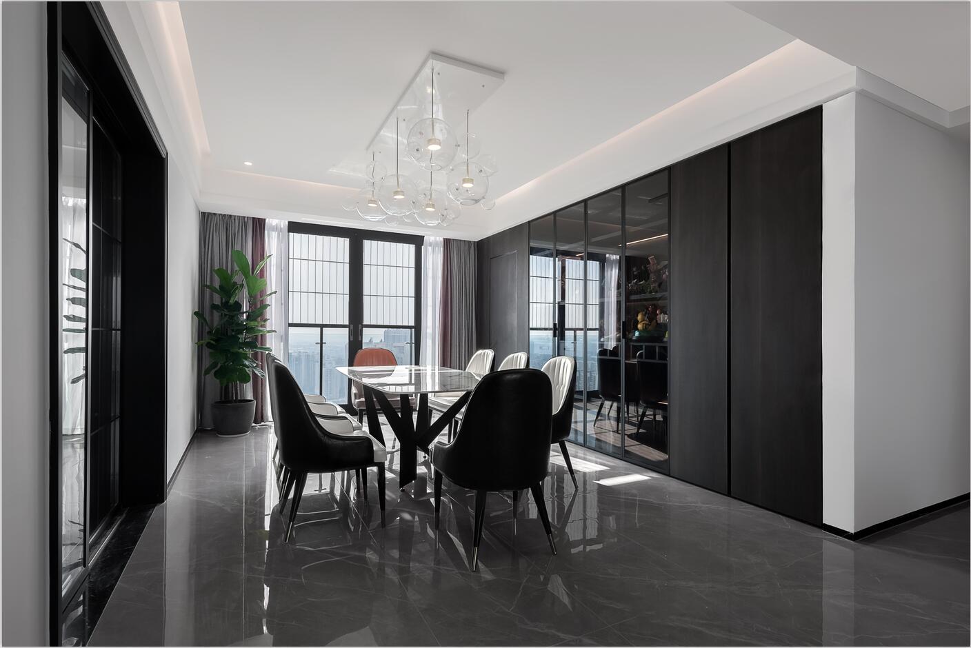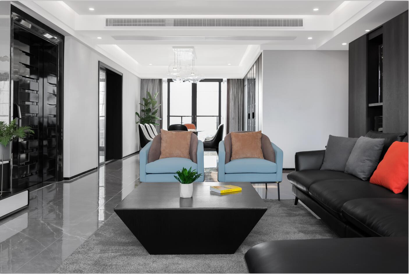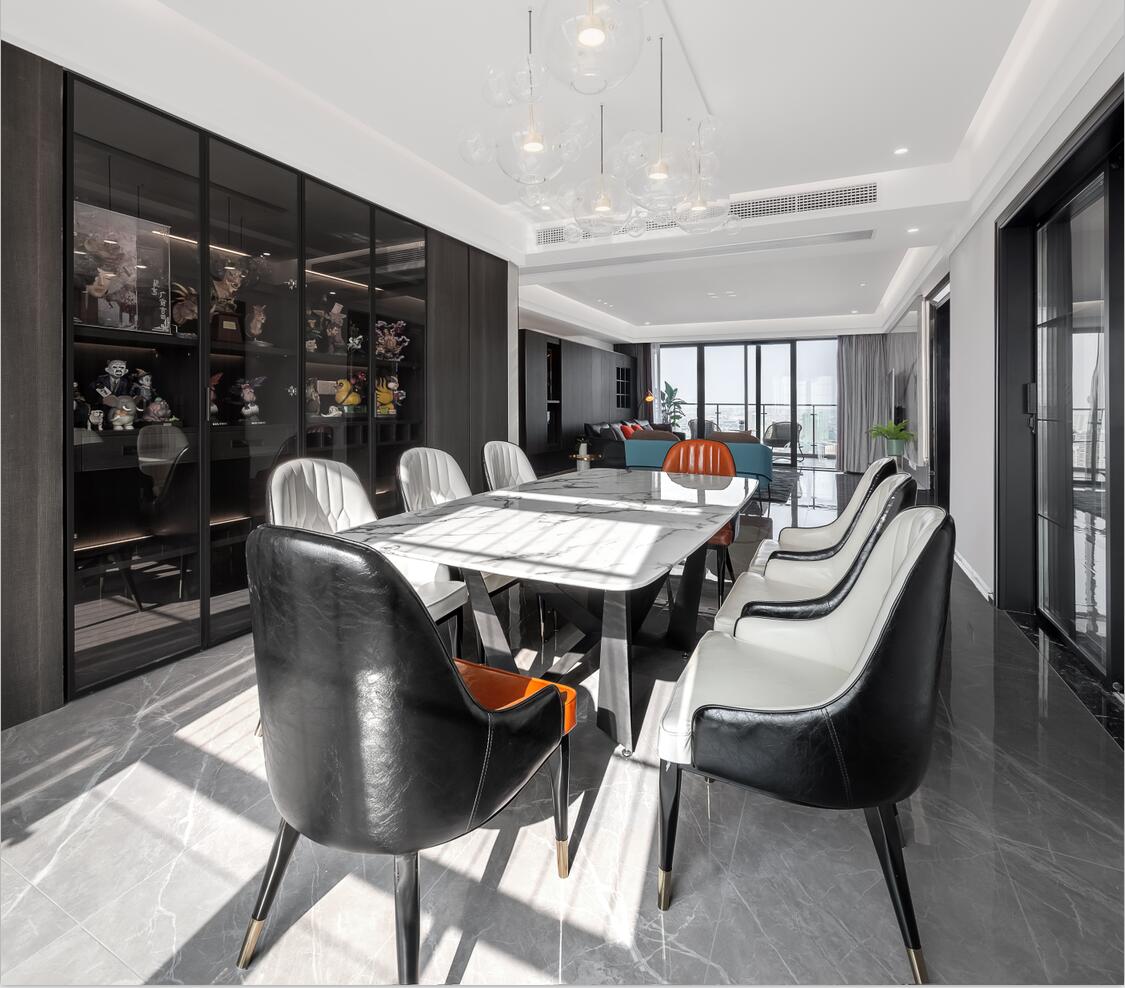 從入戶開始,黑、白、灰為空間奠定了低調、優雅的基調,整體呈現出的是更具現代氣息的極簡風;局部增添了色彩的點綴,為空間帶來一絲跳躍。