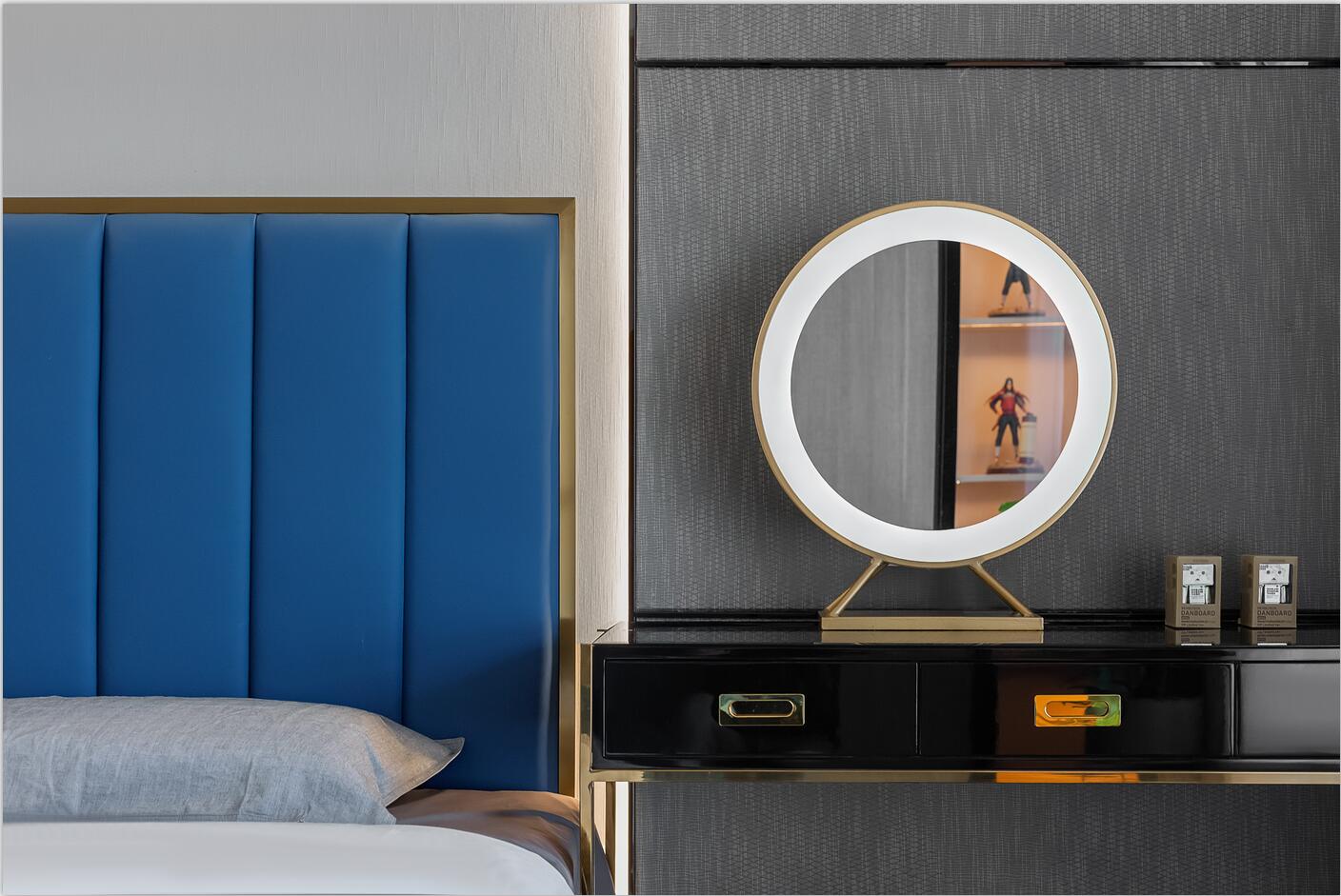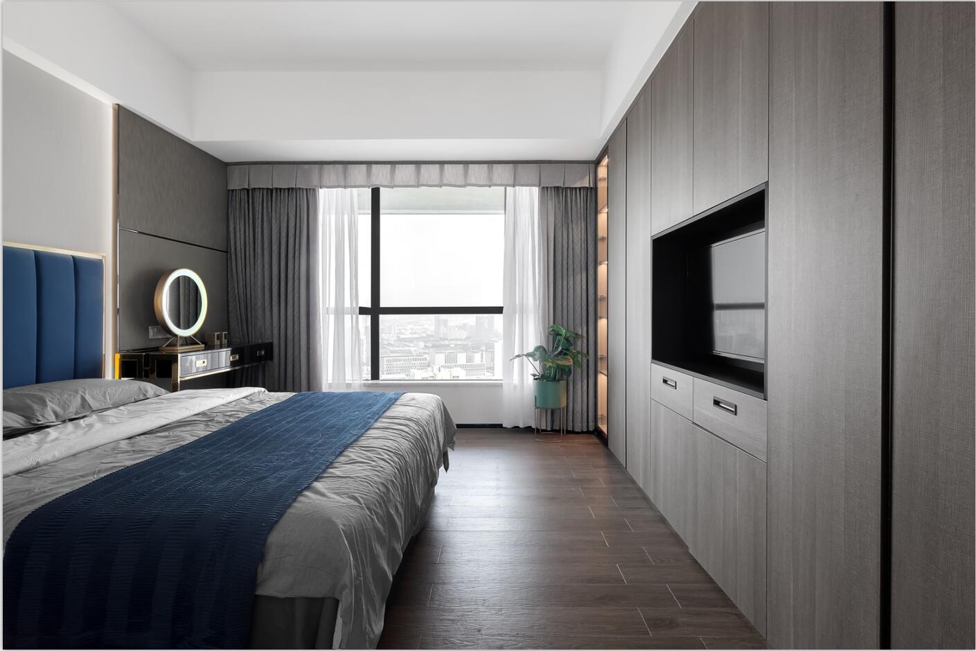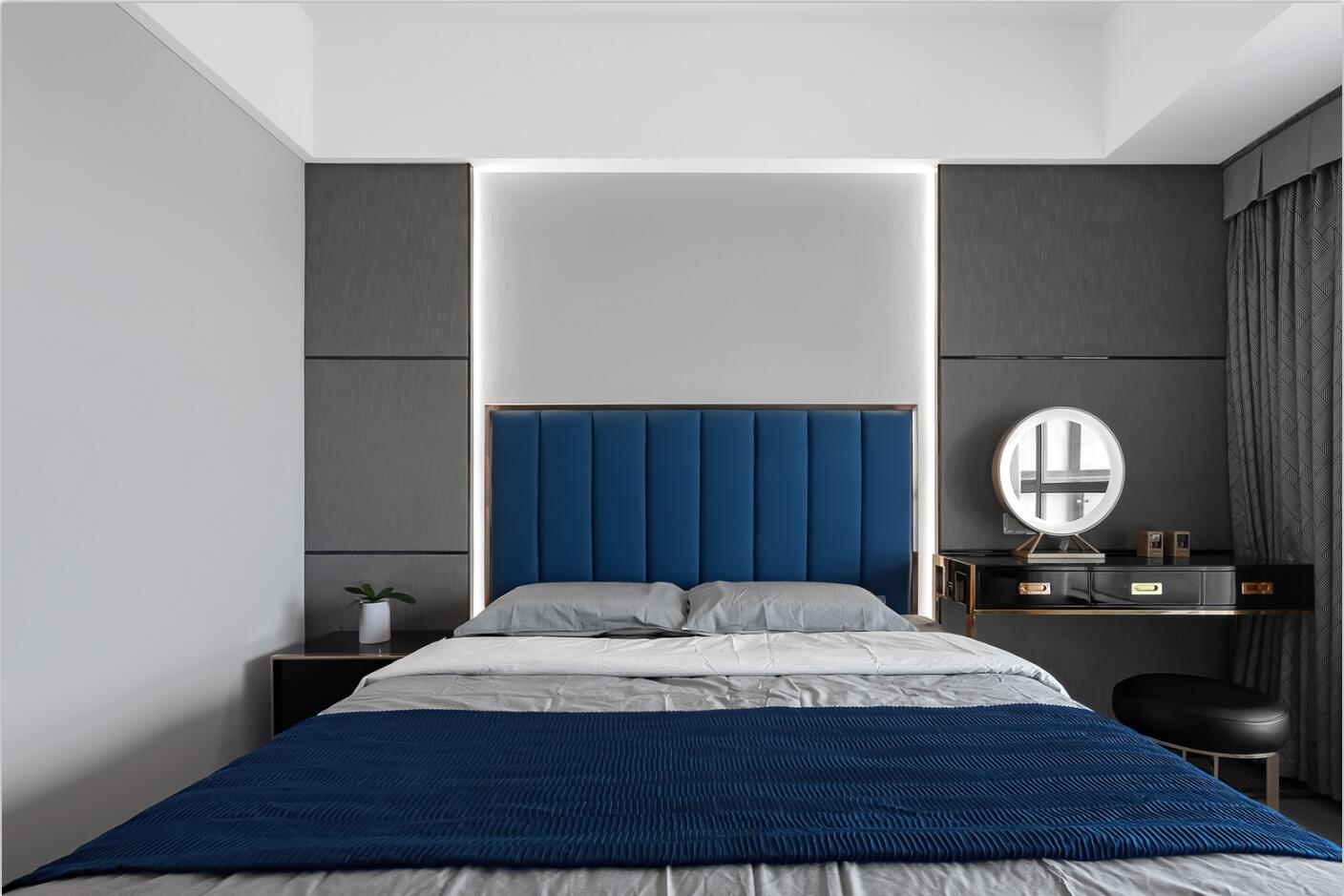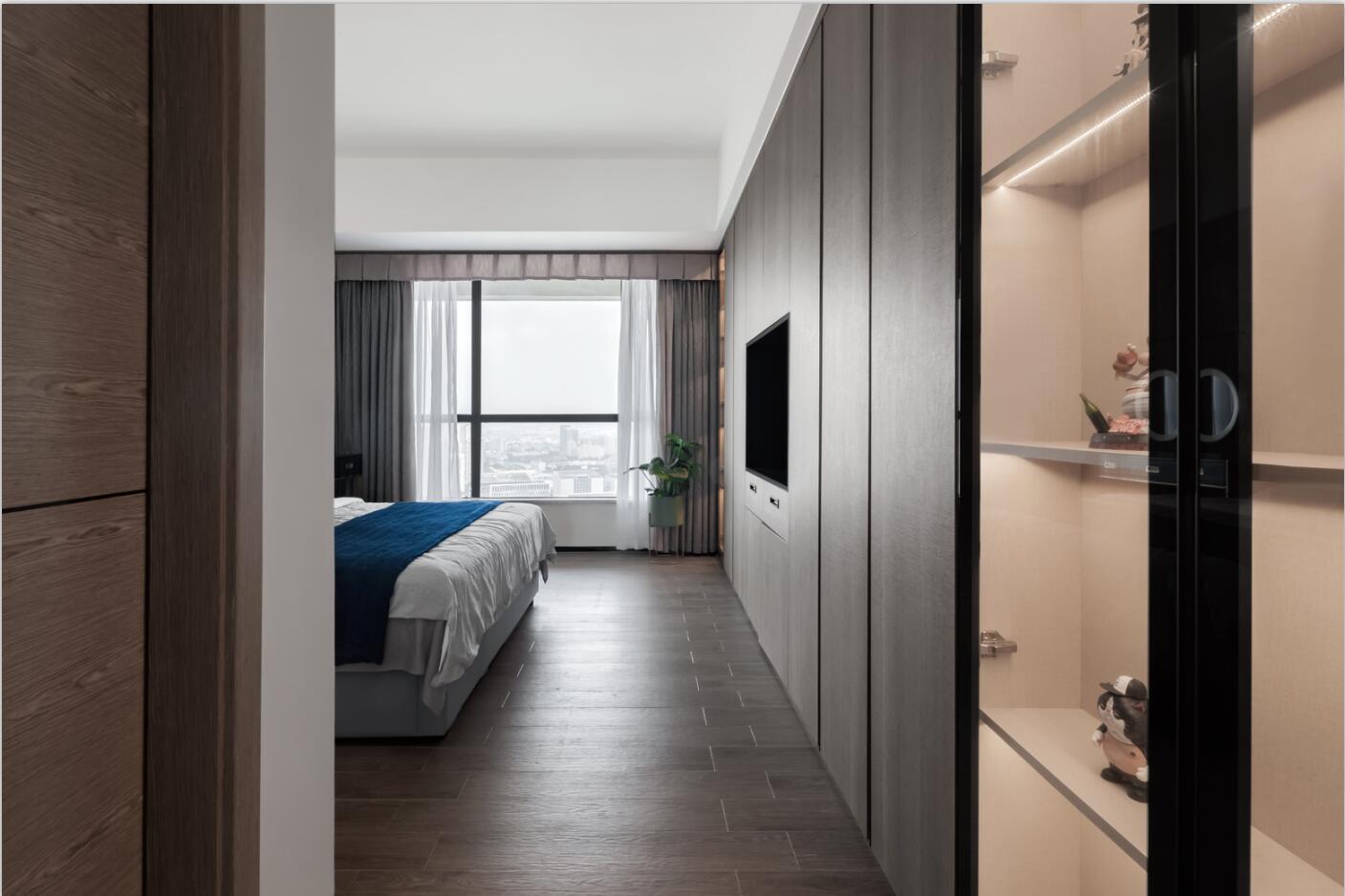 臥室的設計浸透著輕松的優雅,鈷藍色調與原木家具及木紋磚的結合,既能傳遞鈷藍的純凈、平和,也能展現木質的自然肌理,從而獲得寧靜而愜意的視覺體驗。