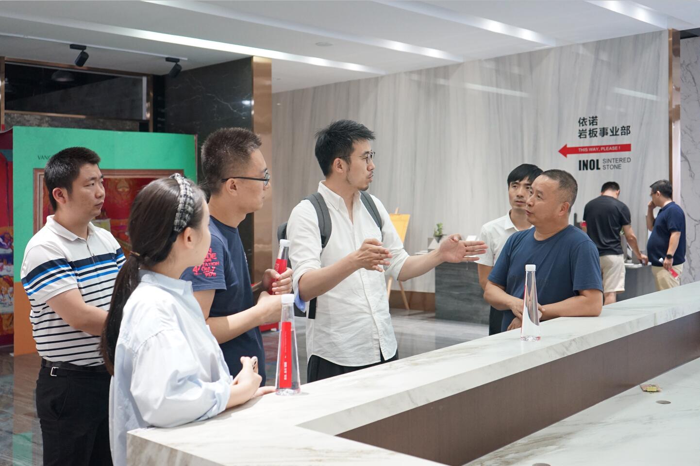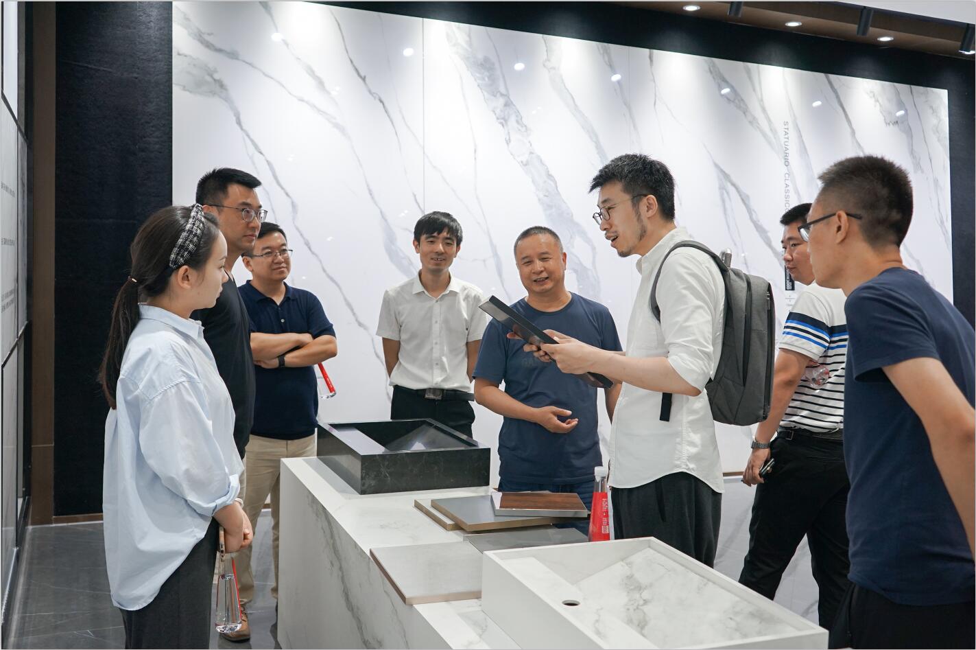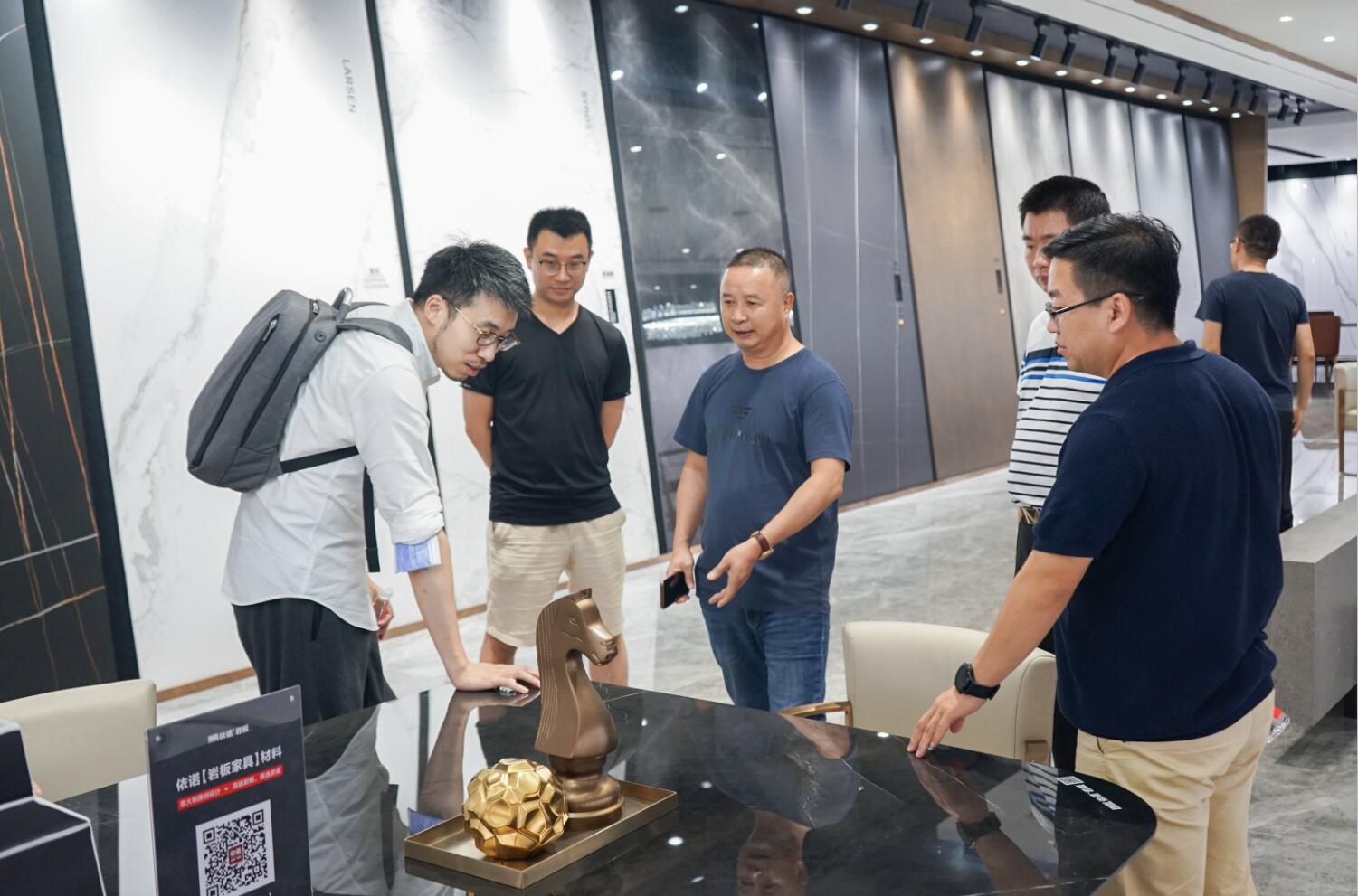 戴總和孫總進行了依諾瓷磚品牌和產品介紹,并重點演繹了依諾巖板和相關一系列巖板定制產品,從產品工藝、設計到空間設計,與設計師們分享依諾的設計美學理念和經驗。依諾瓷磚展廳內一系列緊跟國際潮流前沿的原創設計產品,花色豐富,質感強烈,展示出依諾產品在空間設計中的無限應用可能,在場的設計師們紛紛為依諾瓷磚點贊。