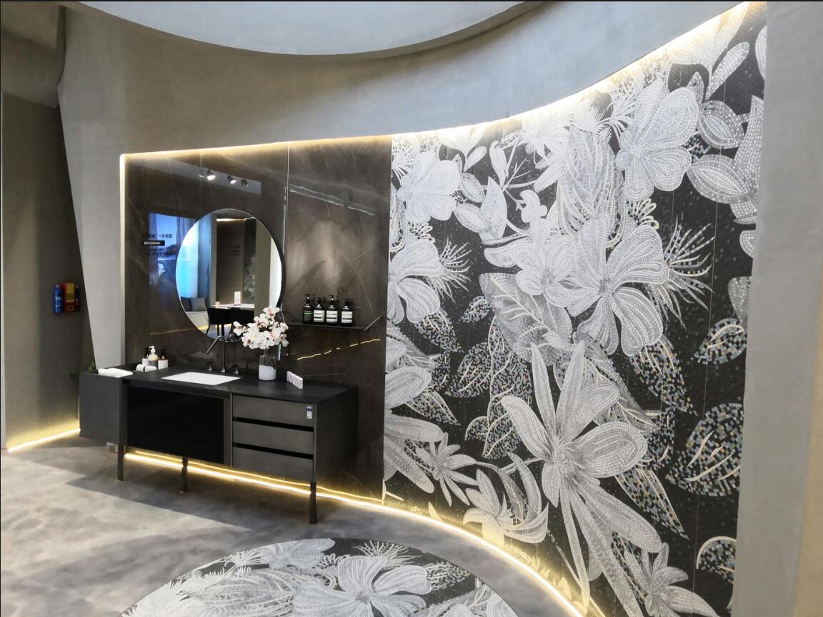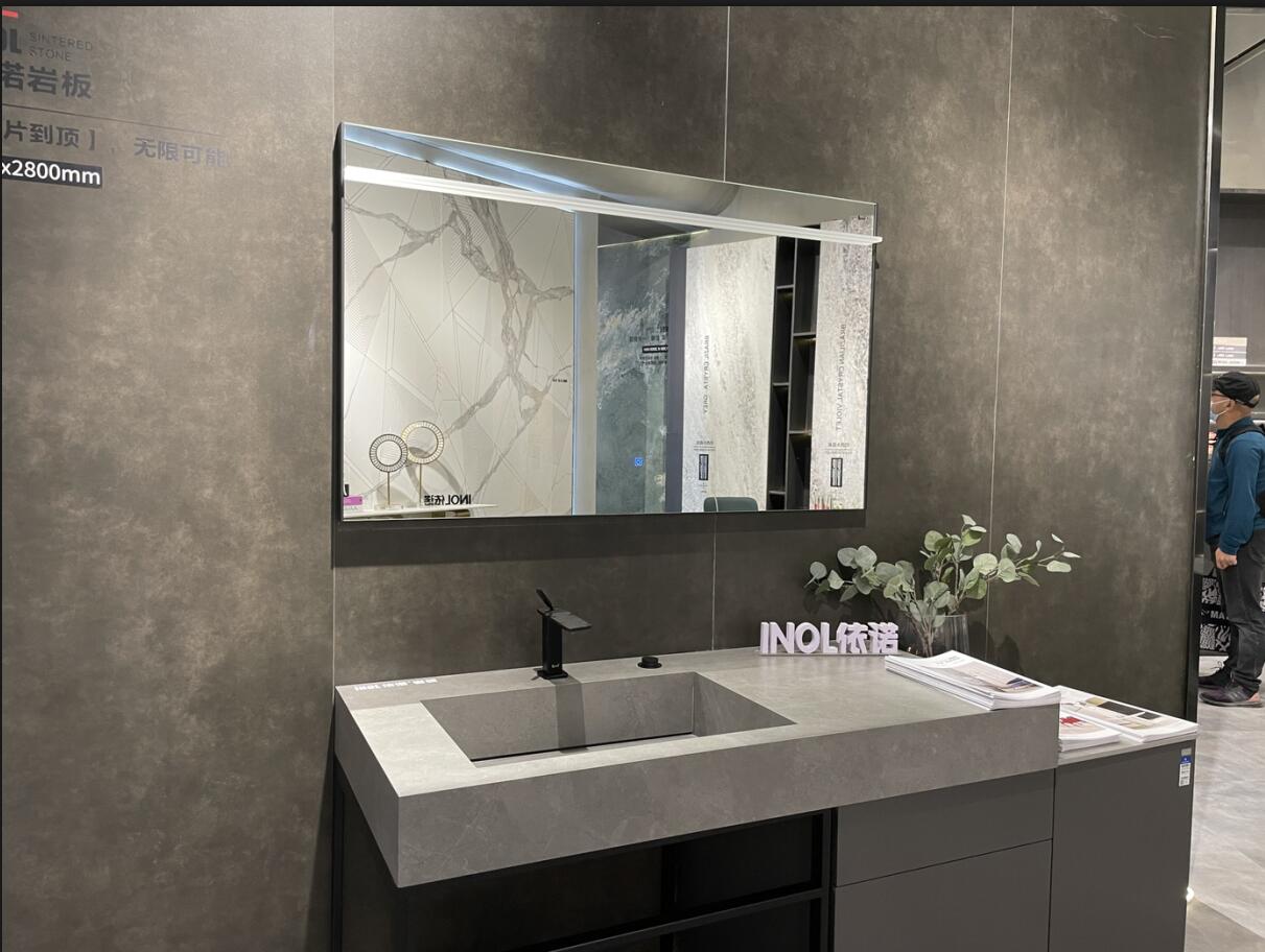 依諾巖板展館內,除了家居背景墻的空(kong)間應用外,還有多款目前市場流行(xing)、暢銷的巖板定制家具浴室柜展示。浴室柜臺面及面板全部選用依諾巖板進行(xing)加工(gong)而成,一看就更顯高(gao)端。