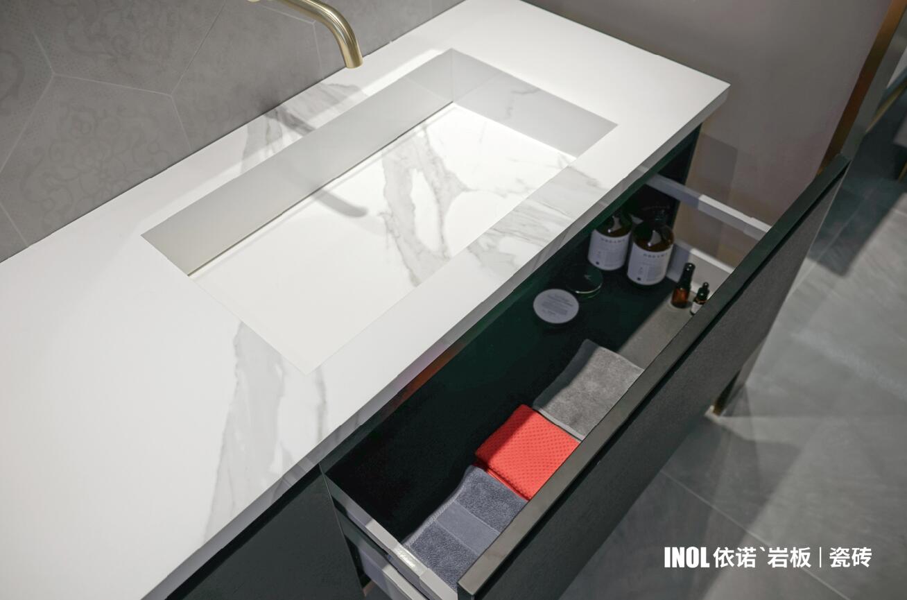 浴室柜承載了日常洗漱、收納等功能,以巖板替代傳統材料,使用起來干凈舒服,不用擔心因吸水或氣溫變化而引起的開裂、發霉、發臭等問題,質感更是其他材料比不了的。