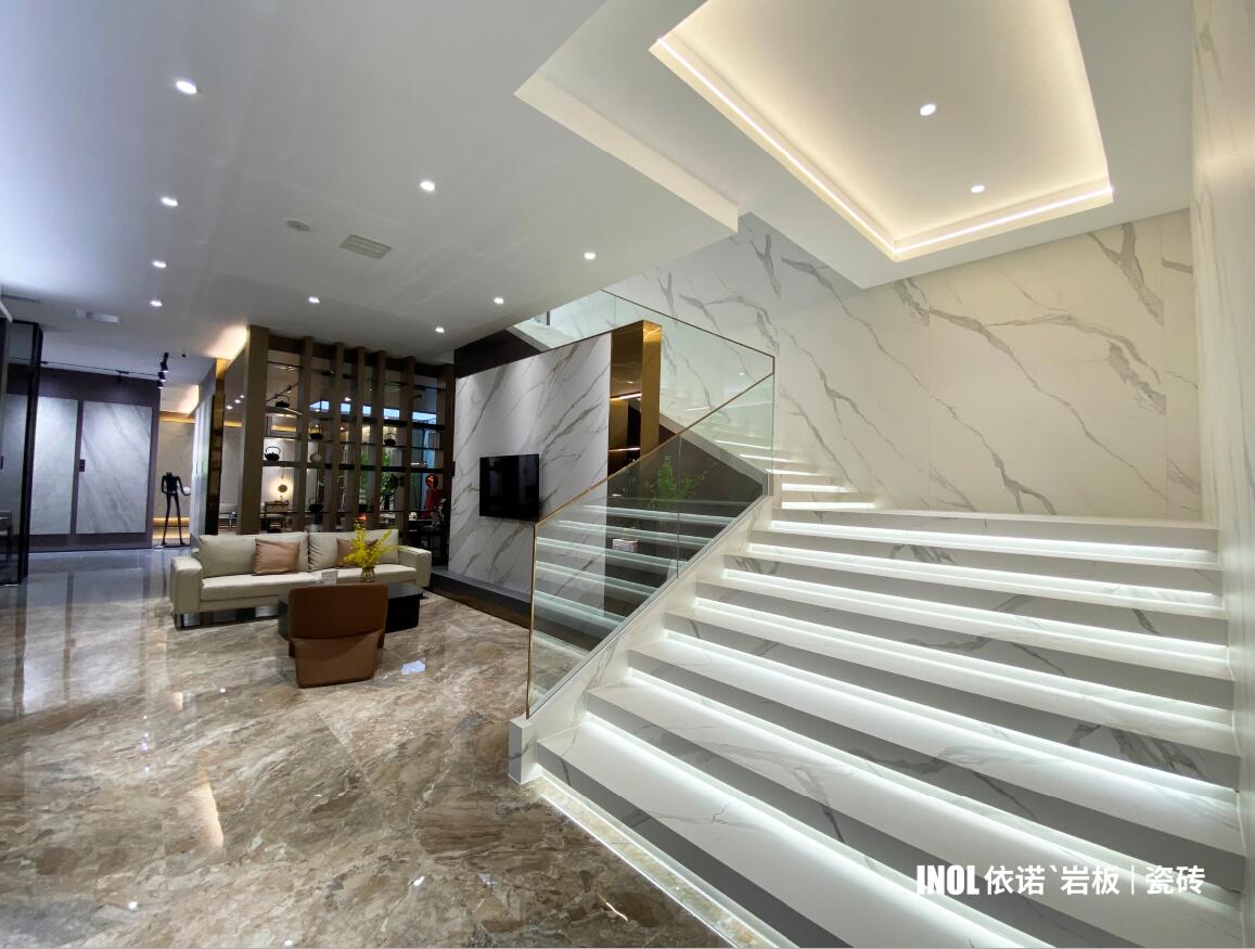 依諾巖板規格、厚度齊全,大空間與小戶型同樣適用;且硬度超越不銹鋼,不懼日常刮擦和撞擊,用于地面或步梯,不僅顏值能打,性能也抗造。