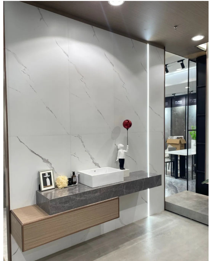 門店入口與接待處,使用了當下更受歡迎的侘寂風格的依諾微水泥瓷磚,細膩的紋理和通透的空間感,舒適寂靜的氛圍在這里悄然上演。市面上流行的風格所需要的瓷磚,在依諾巖板瓷磚都能輕松找到,能夠輕松留住客戶。
