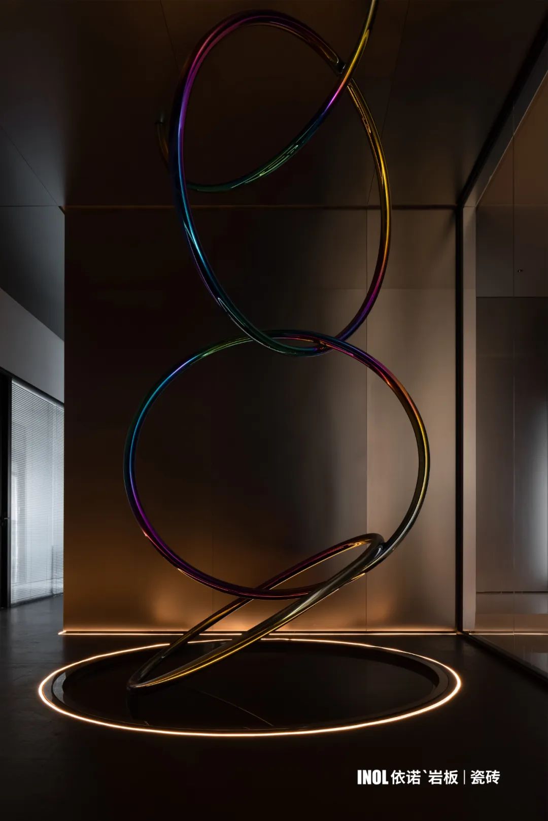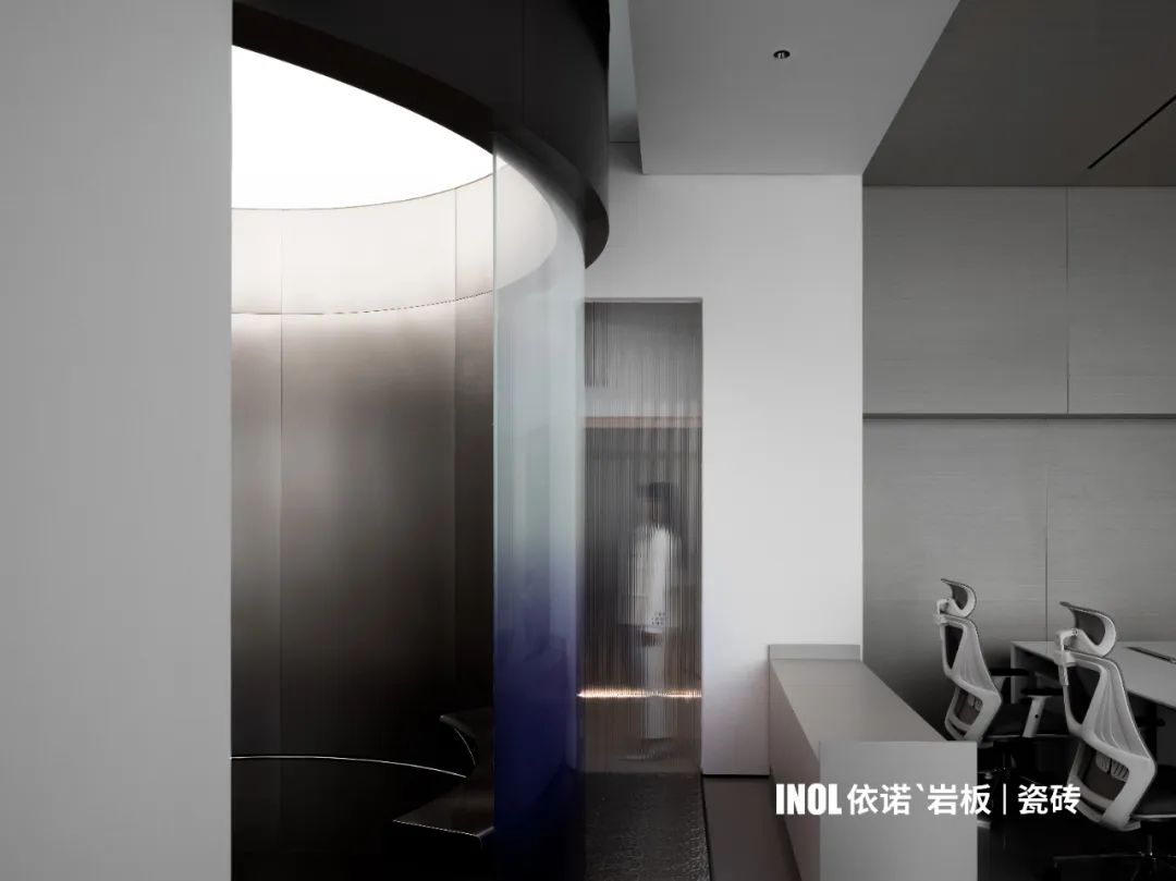 在智能辦公區(qu)域,設計師采用大(da)量圓形(xing)(xing)(xing)和方形(xing)(xing)(xing)結構穿(chuan)插其(qi)中(zhong)(zhong),使(shi)空間形(xing)(xing)(xing)成虛實變(bian)幻的(de)狀態。吊頂采用鏡面(mian)材質,帶來無(wu)限開闊的(de)空間視覺,巖板(ban)、金屬、砂鋼、木飾面(mian)等(deng)多種(zhong)材質在充滿幾何線條感的(de)空間中(zhong)(zhong)疊加融(rong)合,改變(bian)了極簡平淡的(de)氛圍,展現(xian)出(chu)強大(da)的(de)藝術表(biao)現(xian)力。