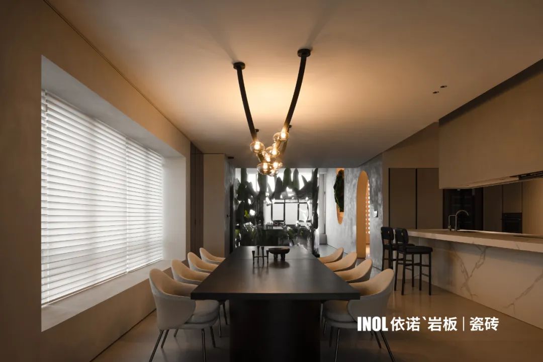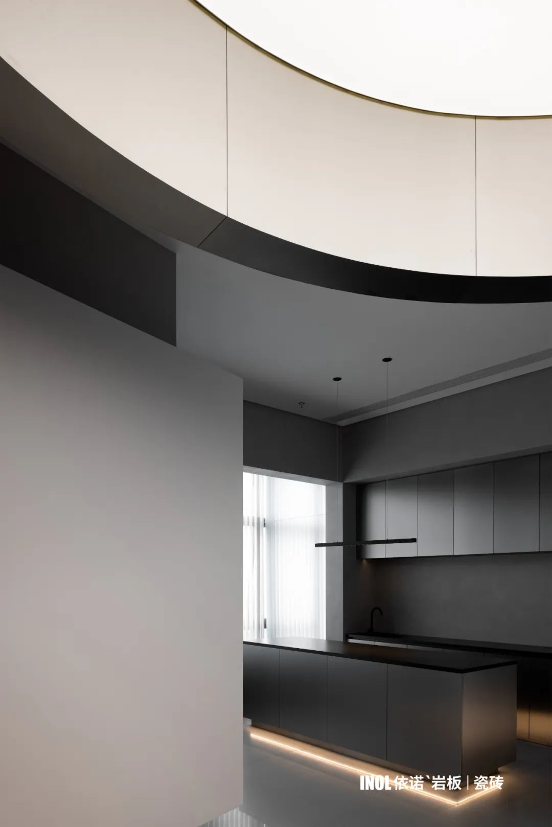 開放式的西廚空間,用簡潔有力的線條塑造出空間的秩序感,搭配簡約的巖板島臺,放眼(yan)望去是極致的舒適。