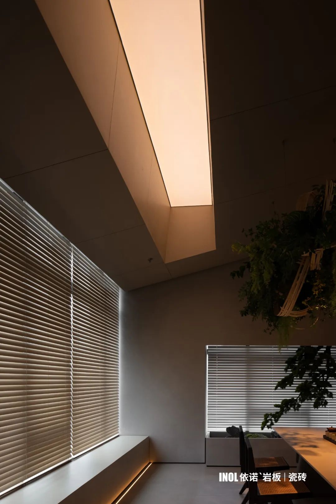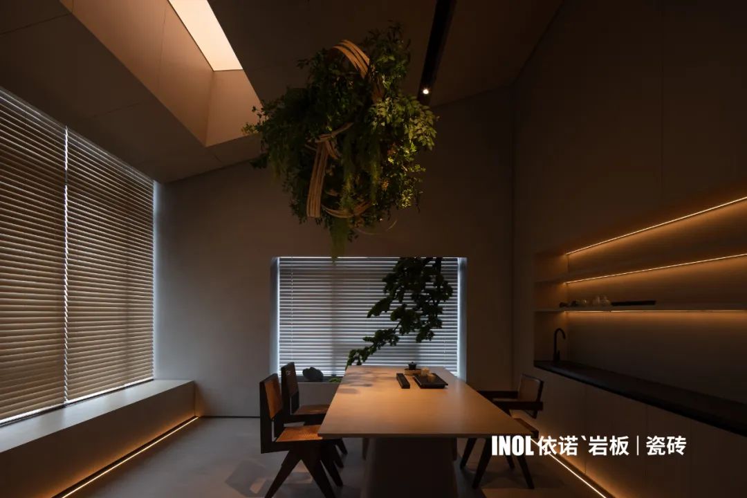 茶(cha)室天花、墻面都使用溫潤細膩的木(mu)質(zhi)墻板和(he)木(mu)質(zhi)百葉(xie),搭配微水(shui)泥巖板的地面材質(zhi),輔以(yi)柔(rou)和(he)的暖色光帶(dai),給(gei)人(ren)以(yi)寧靜詫寂之感(gan)。