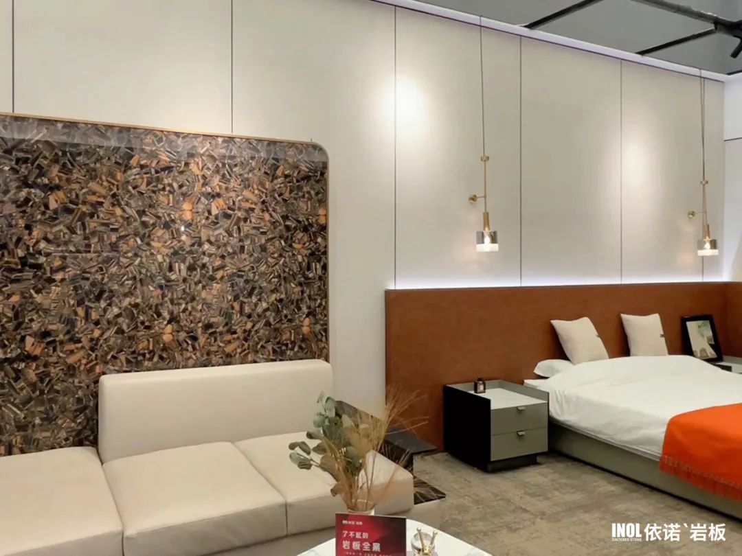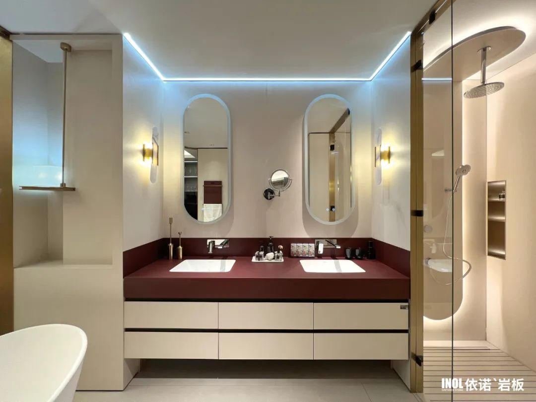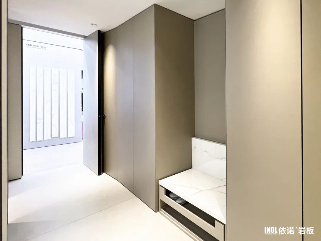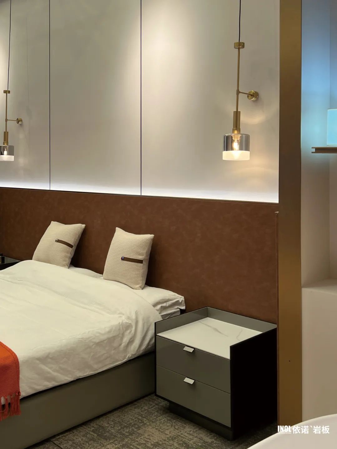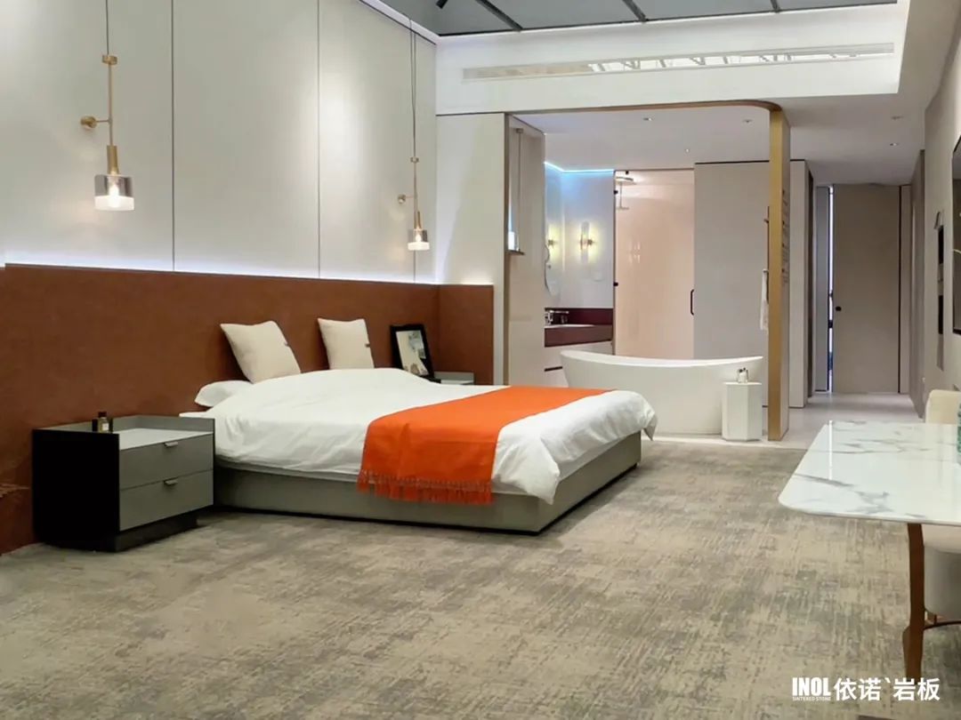 除了花色和規格多樣,依諾巖(yan)板(ban)實(shi)現了全厚度打通,配合(he)巖(yan)板(ban)本身的優越(yue)性(xing)能,在(zai)提升(sheng)空間舒(shu)適度上起到(dao)出色的作用(yong)(yong):例如3mm的超薄巖(yan)板(ban)用(yong)(yong)于(yu)客房門板(ban)、浴室柜(ju)柜(ju)門,不(bu)僅(jin)【自重(zhong)輕】,開合(he)自如,而且(qie)足(zu)夠(gou)【靜(jing)】;6mm巖(yan)板(ban)用(yong)(yong)于(yu)墻(qiang)面地面,0甲(jia)醛0氣味,既美觀又健康(kang)環(huan)保;12mm巖(yan)板(ban)用(yong)(yong)于(yu)浴室柜(ju)臺面,足(zu)夠(gou)堅實(shi),防潮(chao)防霉。