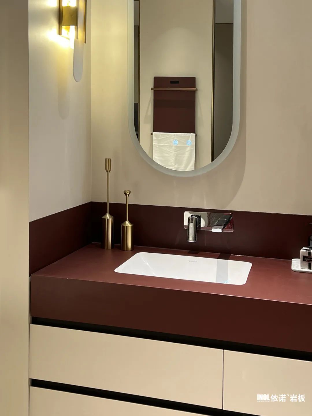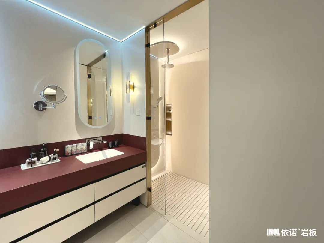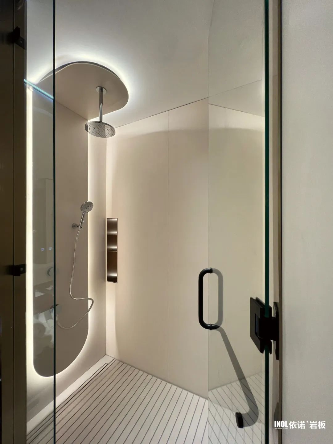 【衛生間】里,除了(le)墻地和浴室柜(ju),壁龕(kan)系(xi)統(tong)、智能電熱毛巾架也使用(yong)了(le)巖(yan)板,展示(shi)了(le)巖(yan)板的創意應用(yong)。