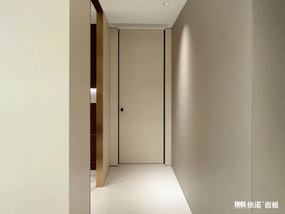 【客房】門口(kou)的左手邊,從衣柜、行李架、mini吧(ba)臺,再到電(dian)視背景墻,每一處(chu)都只用了(le)一種材料進行貫穿,那就是依諾巖板。依諾巖板的【一體化】應(ying)用,巧(qiao)妙地(di)將不同的局部聯(lian)系在(zai)一起(qi),極大地(di)提升了(le)空間的高級感。
