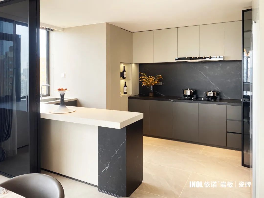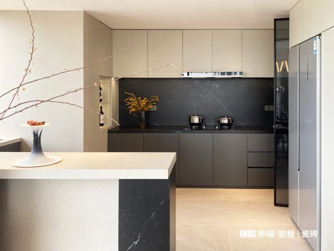 以巖板【萊姆石】及【莎士比亞黑】打造的廚房,將線條美學融入整個空間,聯通公共區域,視線一路展開,提升了整體的通透感和互動性。