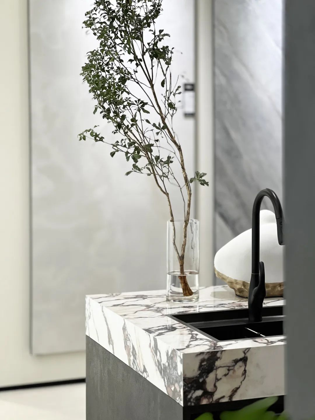 樣板空間以百搭的(de)黑、白、灰色系的(de)大理(li)石(shi)紋理(li)產品為主(zhu),選材(cai)區(qu)則以精(jing)心的(de)比例排(pai)布和肌(ji)理(li)變化(hua),將色彩大膽(dan)、肌(ji)理(li)名貴稀有的(de)奢石(shi)/寶石(shi)系列產品融(rong)入其中(zhong),滿足業主(zhu)/設計師藝術性、個性化(hua)的(de)審美需求(qiu)。