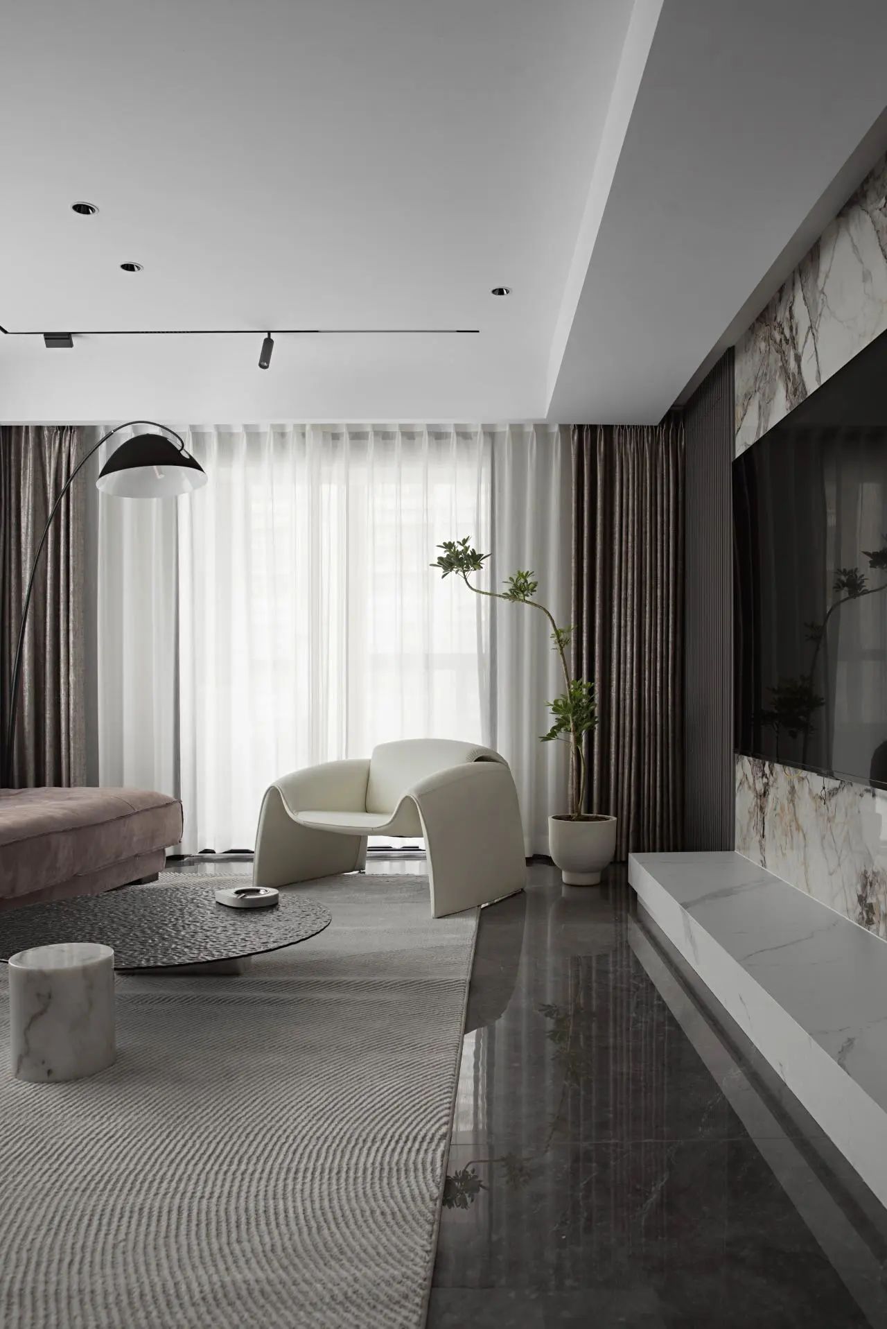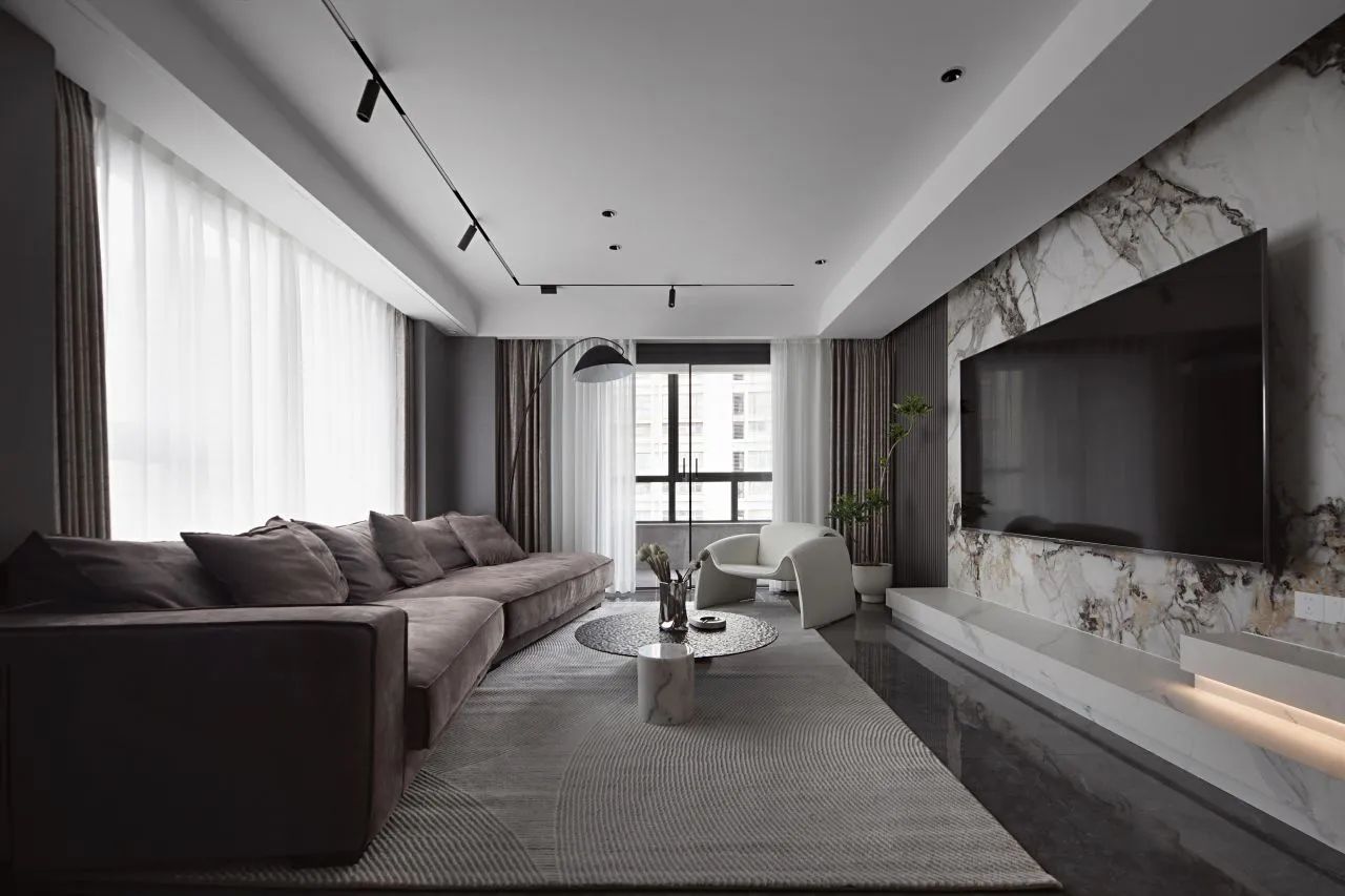 黑、白、灰為主色調空間,以依諾瓷磚【比斯特】貫穿其中,優雅而內斂。米白、咖啡色的出現打破客廳沉靜氛圍,承載起空間的溫暖情境。