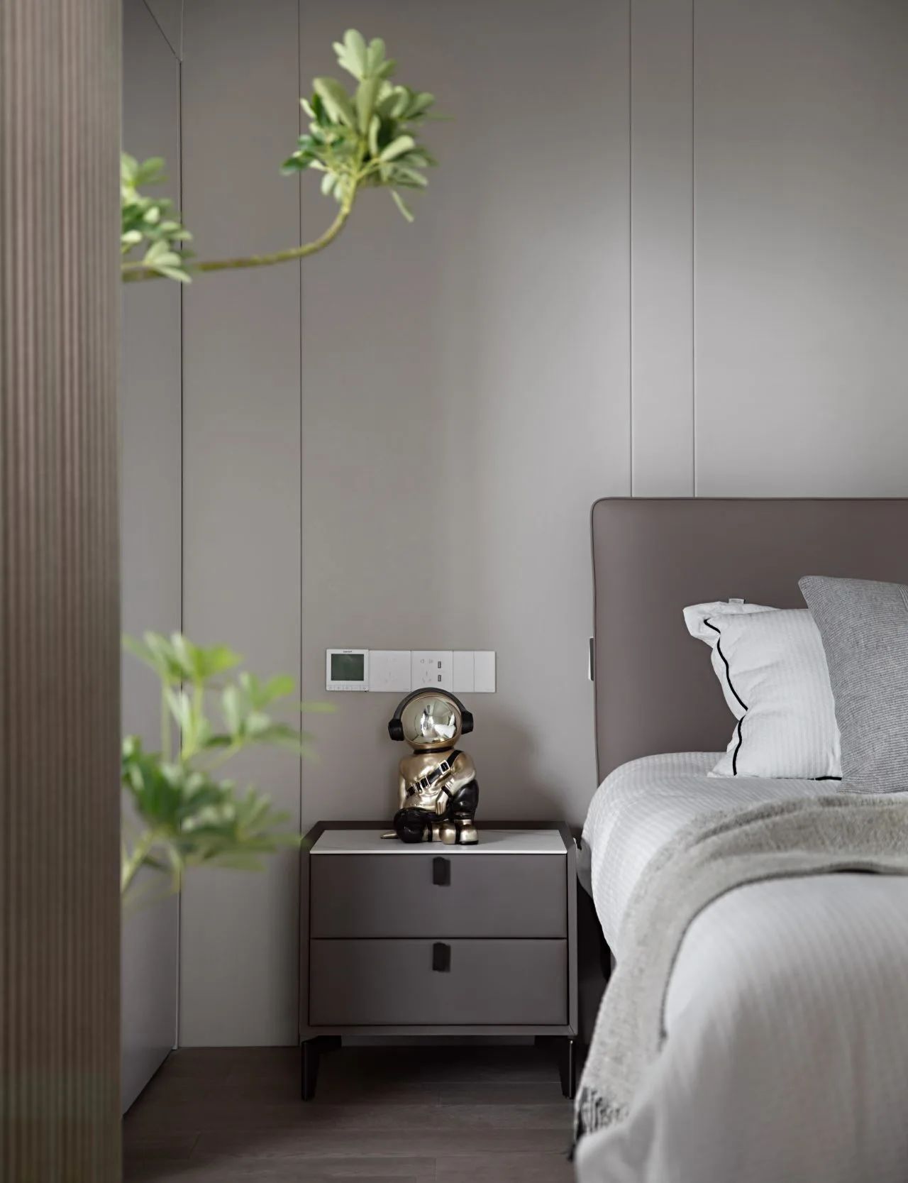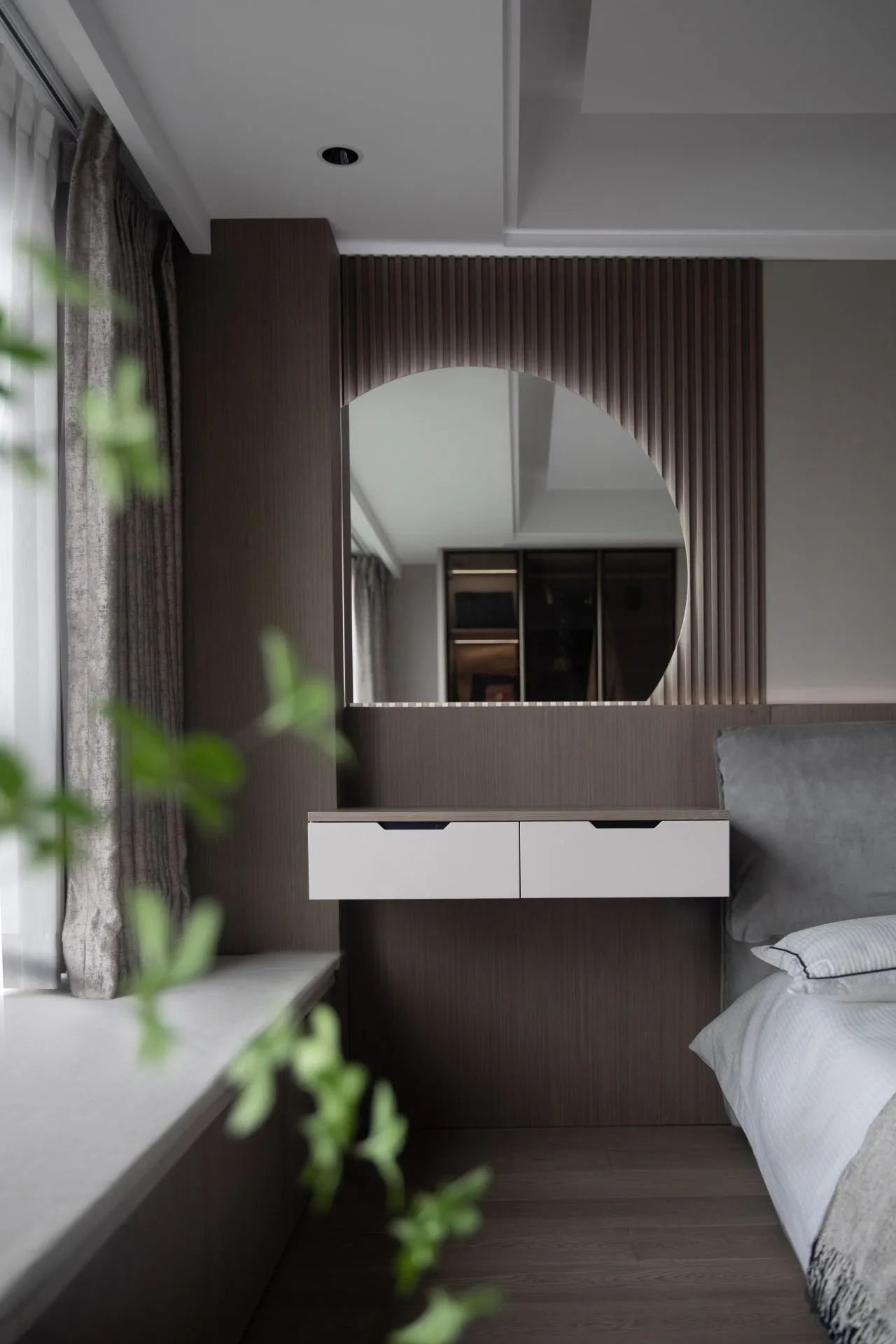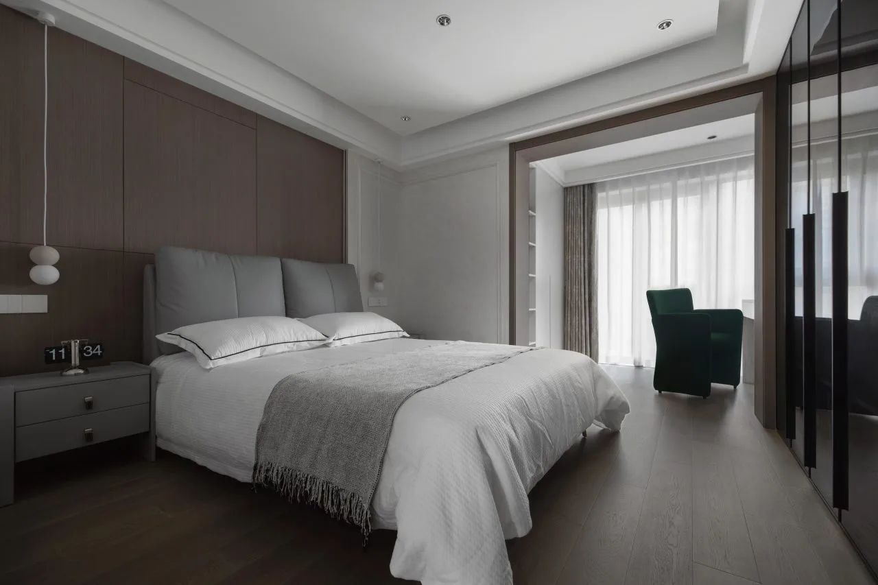 原木材質在沉穩大氣的風格元素中增添了溫潤質感氣息。幾分暖意,在柔和的臥室場景里生長。