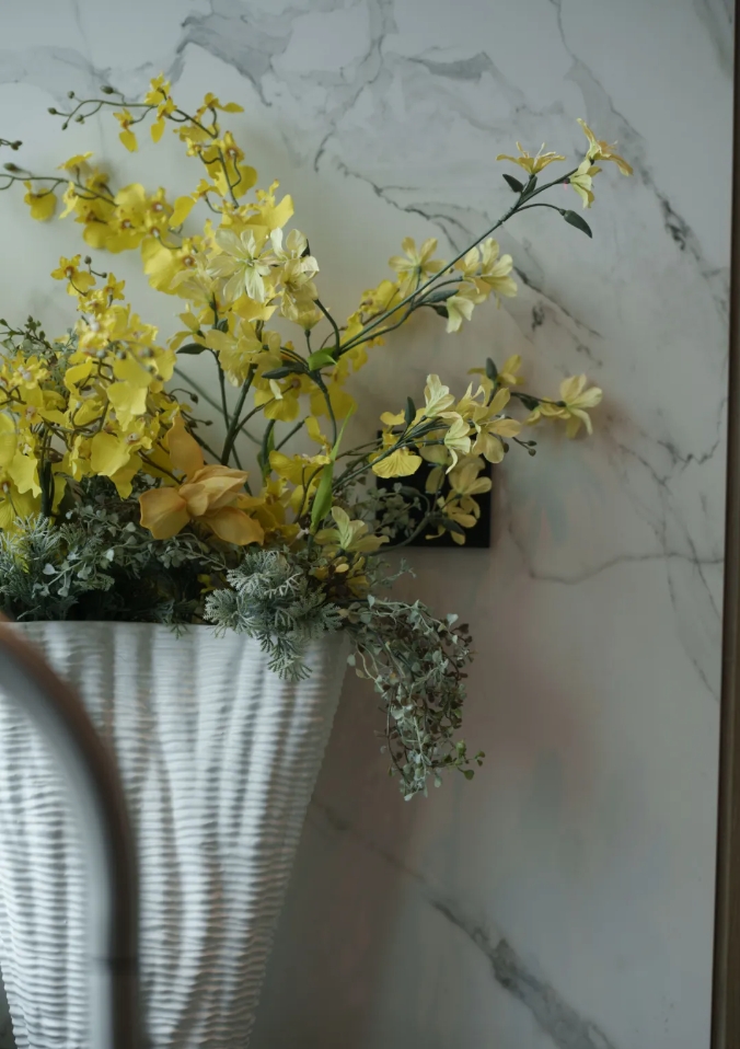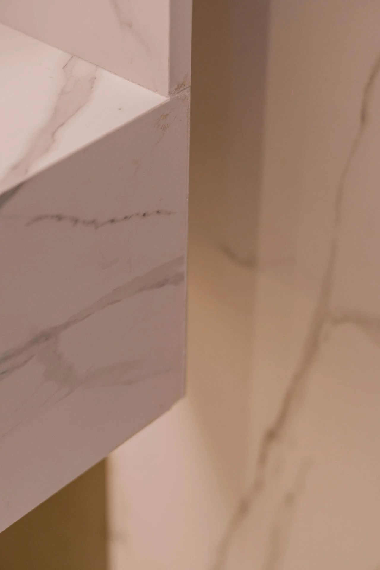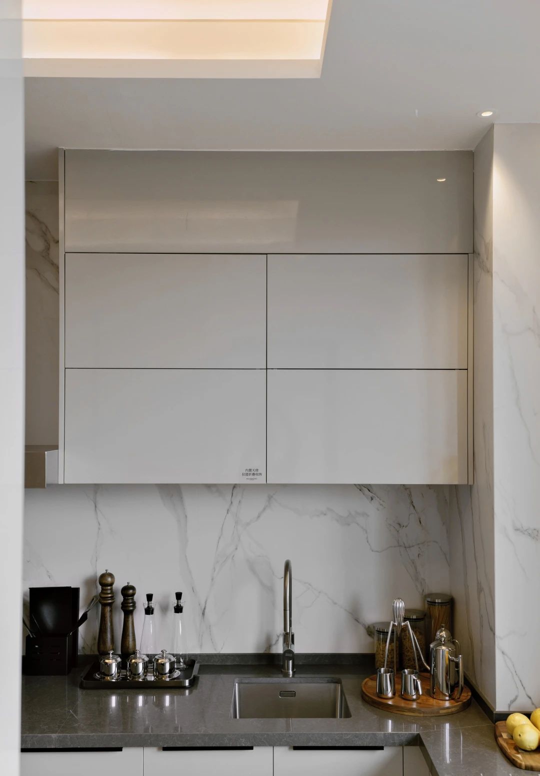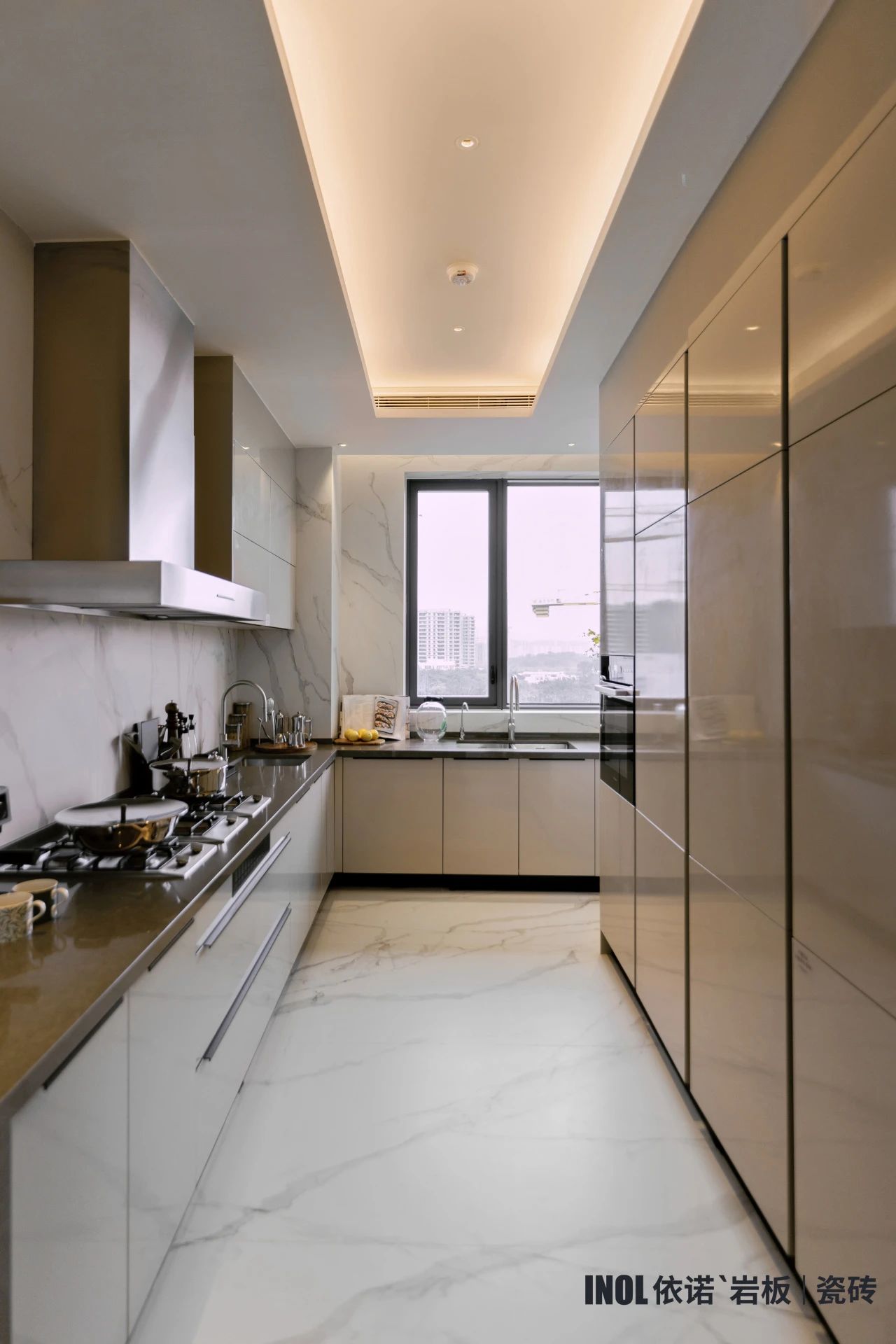 依諾巖板【紳士白】墻地搭配,呈現空間的溫和質感,為餐廚空間加持靜謐之意
