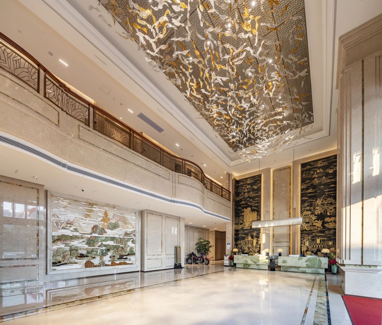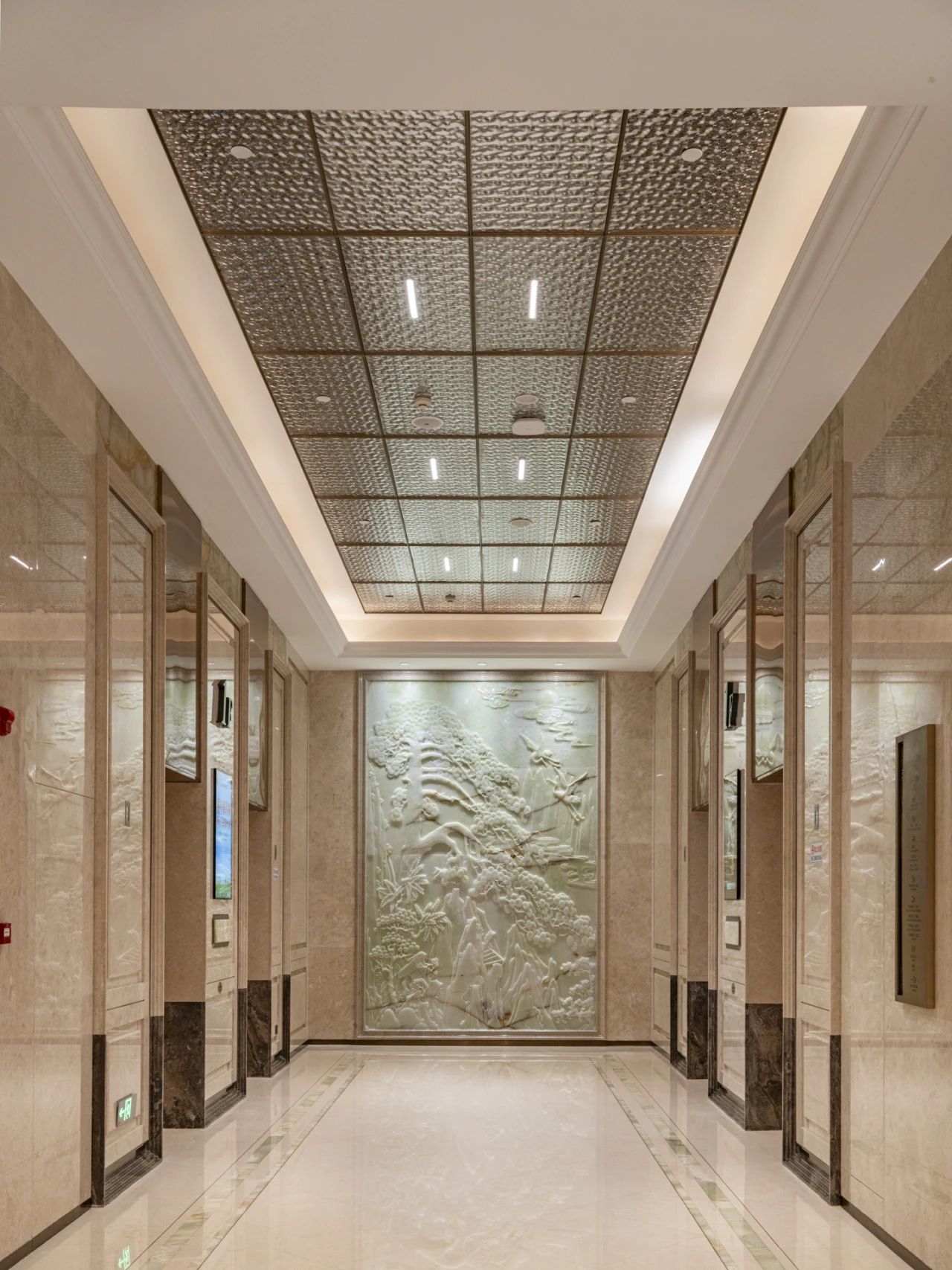 步入大堂 【江海意境】主題的玉雕端景(jing)映入(ru)眼簾 黑金線雕藝術(shu)墻與玉石元素 讓中(zhong)式(shi)美學文化自然而(er)然發生