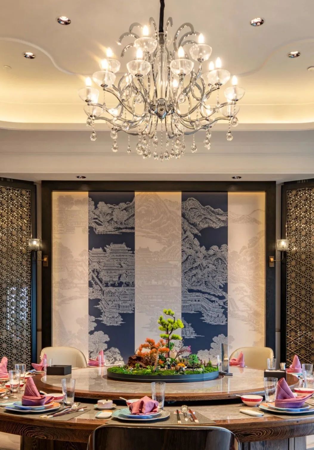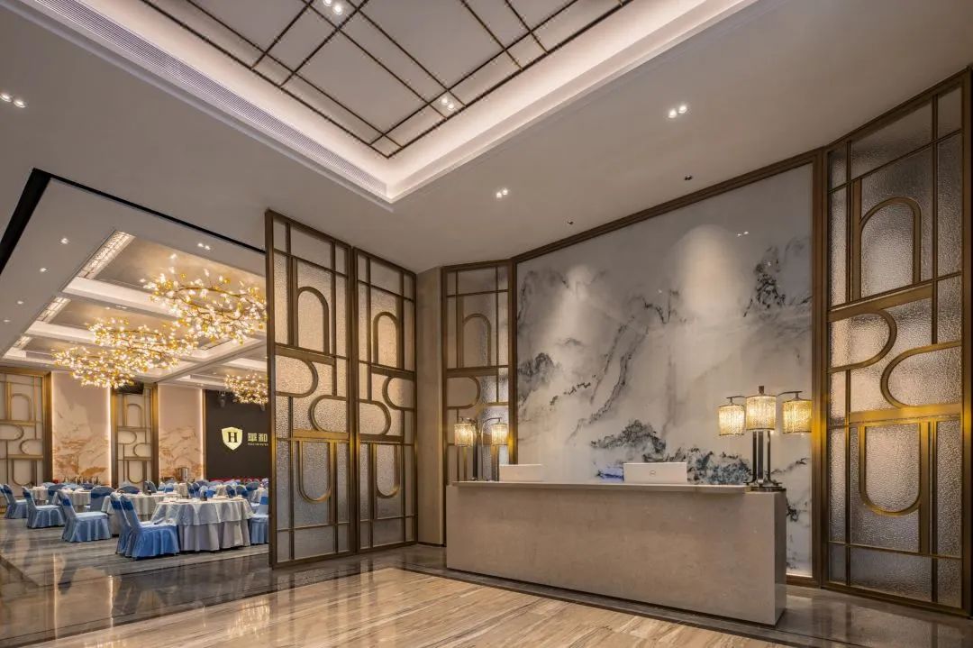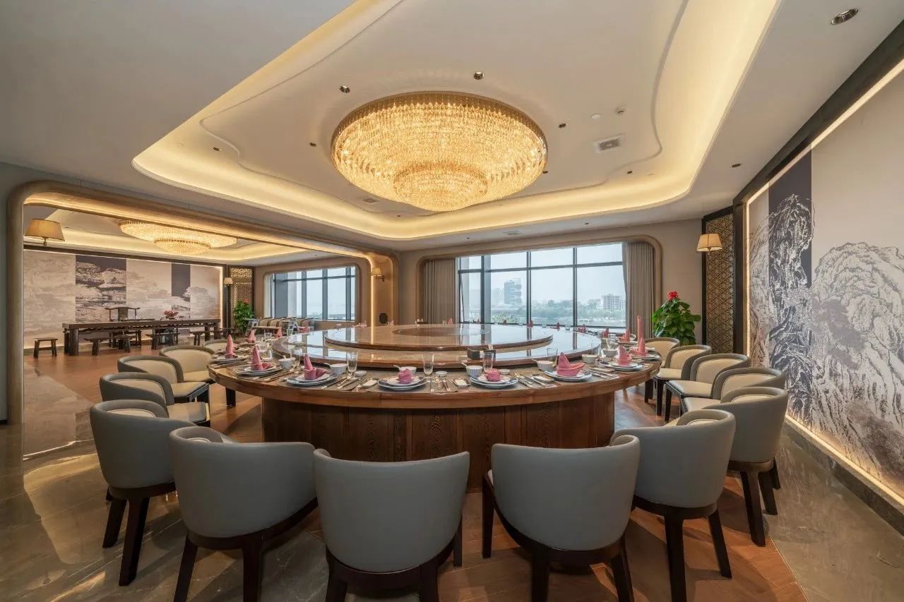 宴會空(kong)間以(yi)粵西(xi)文化為(wei)主調(diao)設計 《千里(li)江山圖(tu)》、《富春山居圖(tu)》背景墻(qiang) 將傳統風韻與現代舒(shu)適感相(xiang)融合