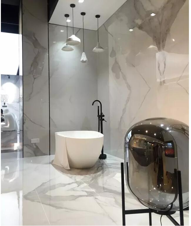 依諾通體大理石館這一次摒棄了陶企最常見的“格子間”式展示方法,而是采用了開放式的結構,通過半通透的墻體、書架、拱門等裝置,模糊區域的分界和功能,更簡潔地將產品呈現出來,這也是國外品牌比較常用的展示手法。所謂“大象無形”,你可以認為這面墻是一個玄關,也可以認為它是一面背景墻,它并沒有具體的空間屬性,而太過具象的展示有時反而會束縛你對產品應用可能性的認識。