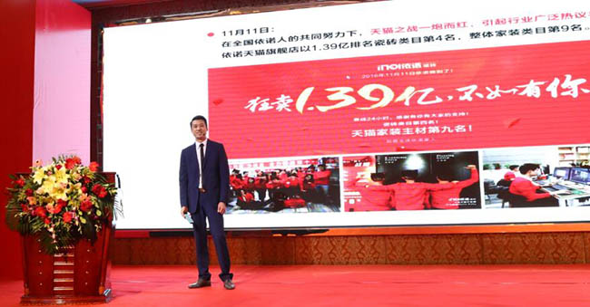 隨(sui)著依(yi)諾(nuo)(nuo)(nuo)(nuo)企業營銷(xiao)中心總(zong)經理(li)田慶忠的(de)(de)(de)(de)上(shang)臺(tai)(tai),依(yi)諾(nuo)(nuo)(nuo)(nuo)瓷磚(zhuan)“成(cheng)人(ren)禮· 江湖會”正式拉開帷幕(mu)。2016年(nian),依(yi)諾(nuo)(nuo)(nuo)(nuo)瓷磚(zhuan) “大(da)”動作不斷,與(yu)意(yi)大(da)利(li)· 天工法(fa)拉利(li)集團合作,引進多臺(tai)(tai)先進生產設備;通(tong)體大(da)理(li)石(shi)瓷磚(zhuan)順利(li)量(liang)(liang)產成(cheng)為業內最(zui)早生產通(tong)體大(da)理(li)石(shi)瓷磚(zhuan)的(de)(de)(de)(de)企業之一,率(lv)先推出(chu)大(da)規格的(de)(de)(de)(de)通(tong)體大(da)理(li)石(shi)和仿古磚(zhuan);11月的(de)(de)(de)(de)天貓之戰,依(yi)諾(nuo)(nuo)(nuo)(nuo)更是一炮(pao)而紅(hong),以1.39億的(de)(de)(de)(de)成(cheng)交量(liang)(liang)位列瓷磚(zhuan)類排名第四,一夜(ye)間,無人(ren)不識(shi)依(yi)諾(nuo)(nuo)(nuo)(nuo);這一年(nian),依(yi)諾(nuo)(nuo)(nuo)(nuo)從(cong)默默無聞的(de)(de)(de)(de)旁觀者,到漸入(ru)佳境的(de)(de)(de)(de)行(xing)業新貴,成(cheng)為行(xing)業熱議與(yu)關注的(de)(de)(de)(de)焦點(dian),依(yi)諾(nuo)(nuo)(nuo)(nuo)贏得了大(da)家的(de)(de)(de)(de)尊重和喝彩,但田總(zong)表示,這僅僅只是依(yi)諾(nuo)(nuo)(nuo)(nuo)的(de)(de)(de)(de)一個起(qi)點(dian)。