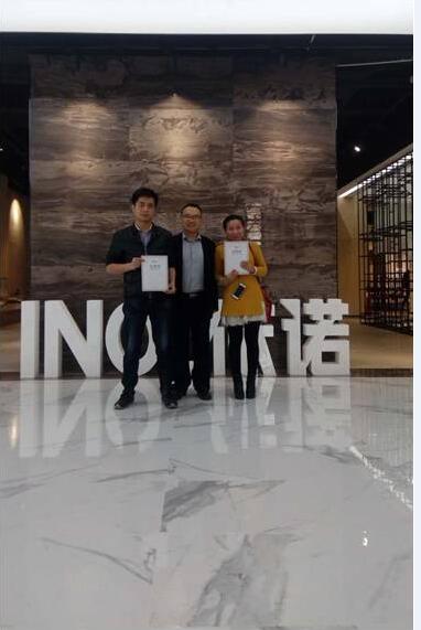 ▲左起為江西依諾瓷磚加盟部熊煜遠、依諾銷售部大(da)區經理冼鍵鏵、江西(xi)依諾管珍