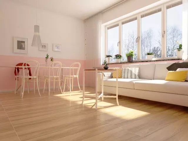 大幅面玻璃窗,加州陽光仿木紋磚,墻裙涂刷成當下流行的淡山茱萸粉,每天都有陽光作伴。
