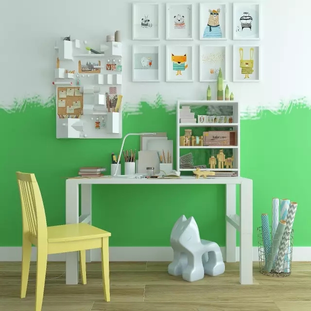 這樣的鮮艷的配色和軟裝可以使用在兒童房,人在孩童時候的視力是比較弱的,強烈對比的顏色會影響視力的養成,所以采用對眼睛較為舒適的亮鎘綠色作為主色。