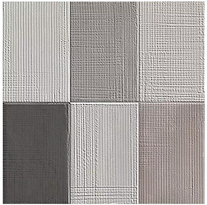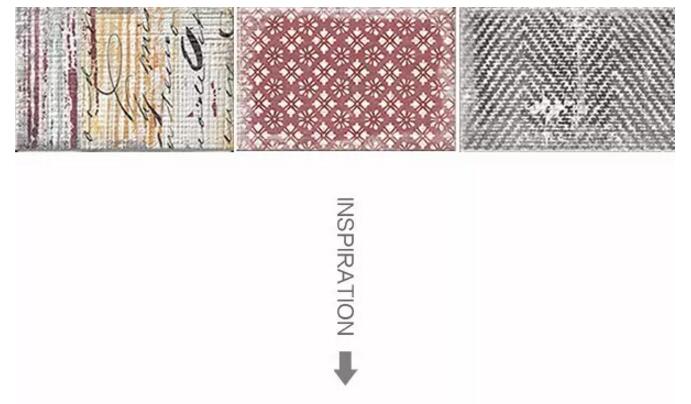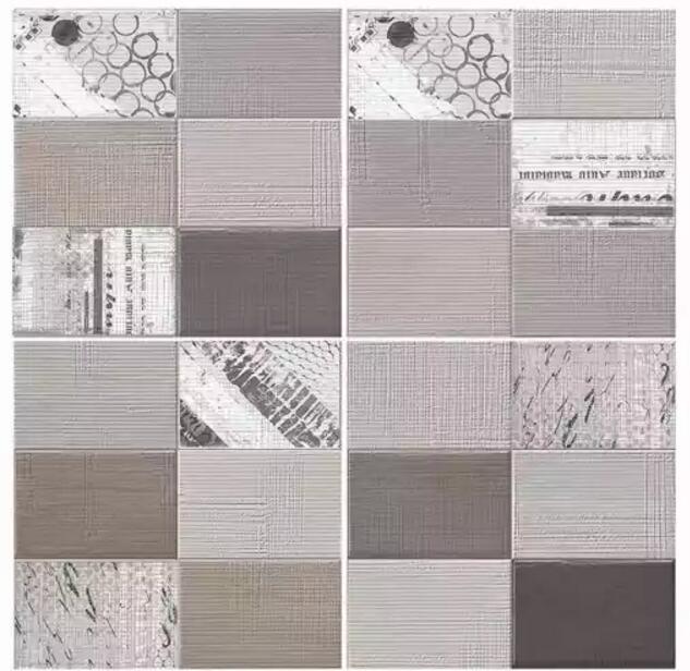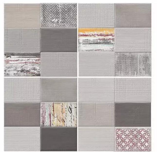 《保拉》系列的釉面磚碰撞主要體現在材質上,把水泥與地毯的肌理混合,碰撞出一種比水泥更溫柔,比紡織品更硬朗的感受,花片配以各種形式的地毯圖案,從寫意的隨性到幾何的形式感,像跳躍的音符被組織在一幅畫面上。