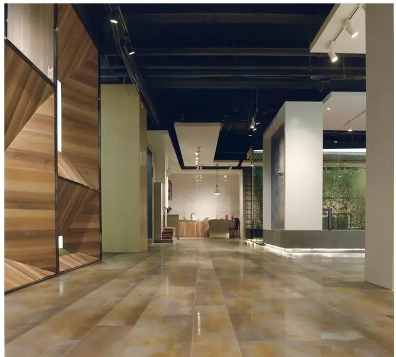 ▲依諾總部展廳實拍,600×1200mm能夠根據空間需要切割成不同規格,鋪貼方式更加多樣化