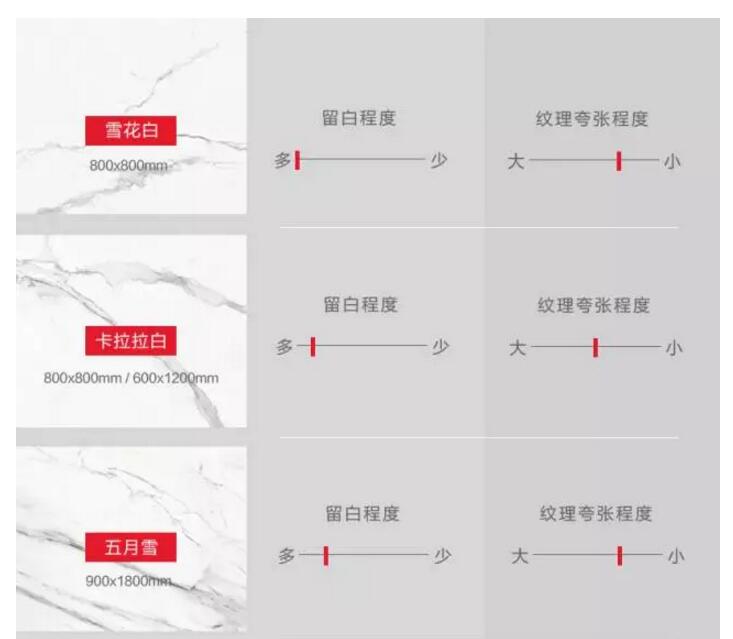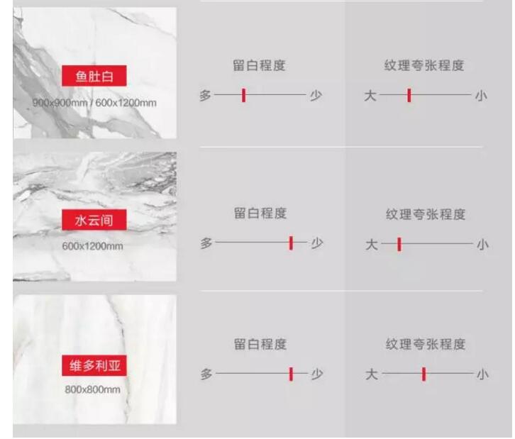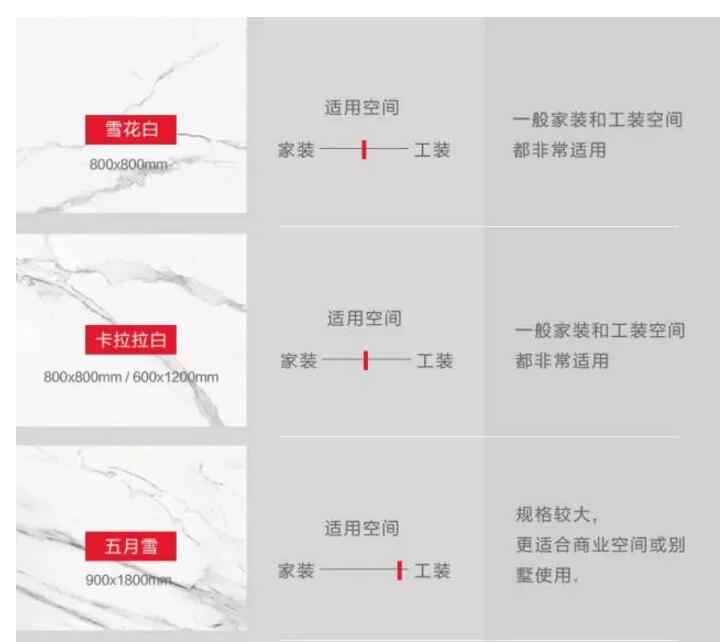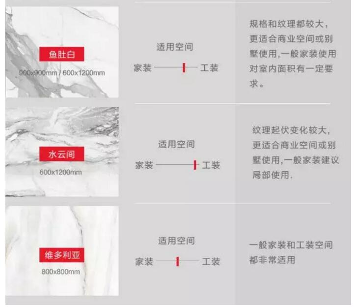 也就是說,留白較多,紋理起伏較小,規格也較小的產品更適合家裝,比如《雪花白》系列,《卡拉拉白》系列,《維多利亞》系列,而紋理夸張,規格較大的產品,適合商業空間和別墅使用,比如《水云間》系列和《魚肚白》系列。