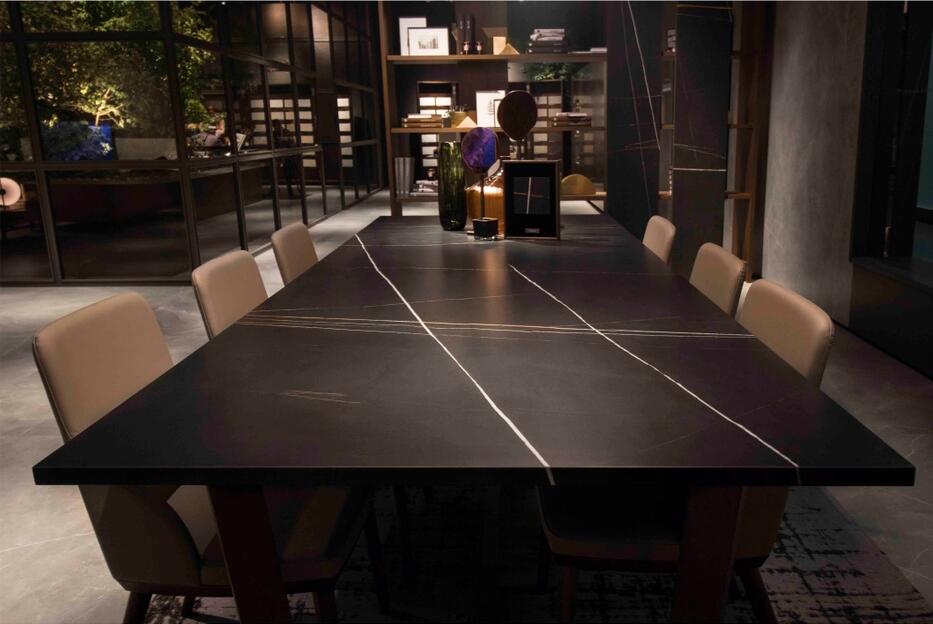 依諾巖板瓷磚晉江新店以500㎡的靜奢之境,不僅是產品陳列空間,更是以巖板/瓷磚為設計語言,開啟一場材質與空間的深度對話。