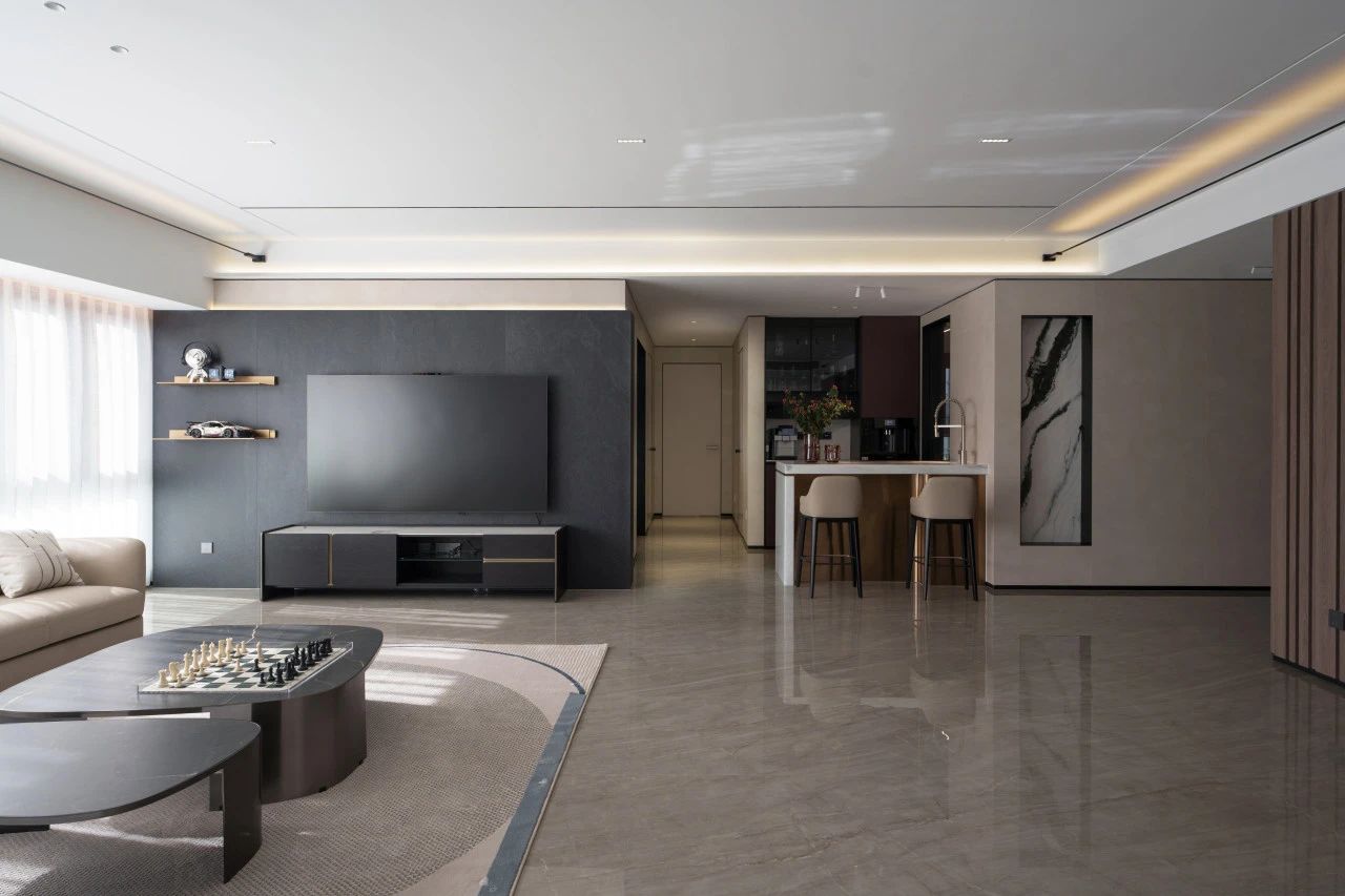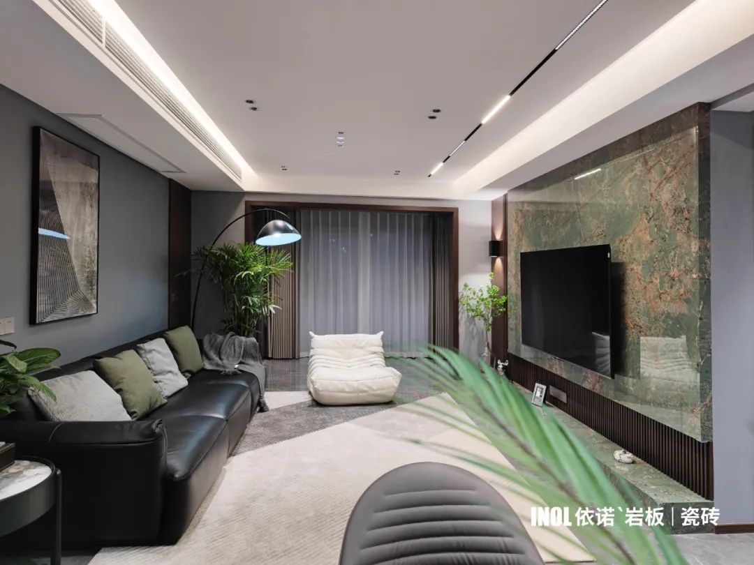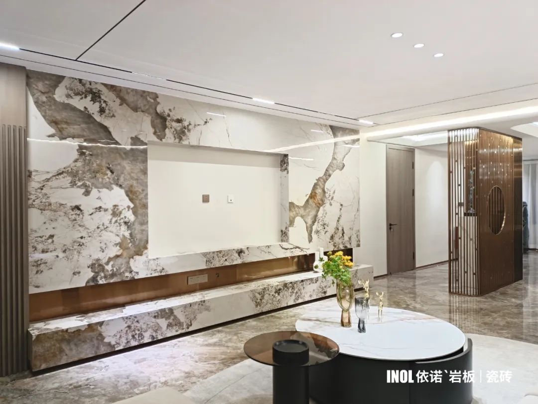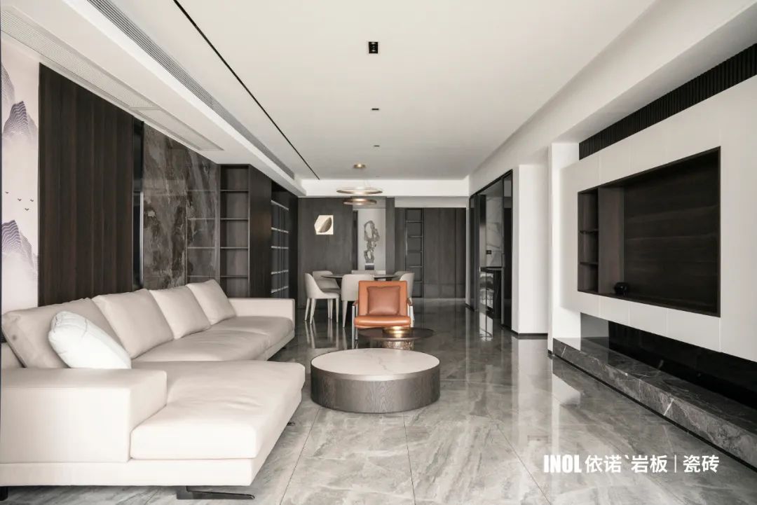 本期依諾巖板瓷磚家裝實景案例,位于廣東佛山·天安鴻基聽濤山莊1000㎡現代空間,現代輕奢風格,在每一個空間里,都能找到理想生活的姿態。