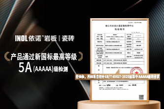 10月17日,由中國建筑衛生陶瓷協會主辦的“2025建筑陶瓷新質生產力發展大會”在佛山隆重召開。會上,公布依諾巖板瓷磚產品成功通過新國標最高等級5A級認證,成為行業內踐行質量分級標準的先行者之一。