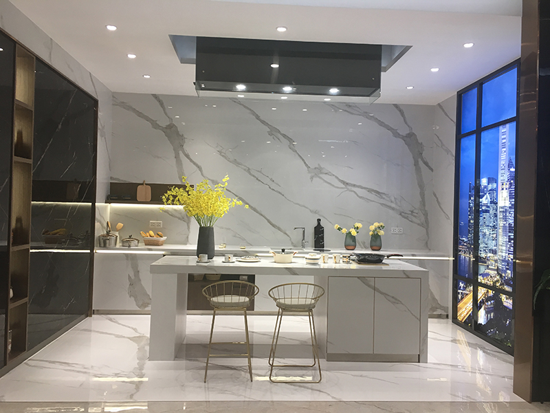 依諾巖板瓷磚新品【維多利亞白 】,750×1500mm規格,中小戶型友好/大空間適配,可通過同一方向任意拼接實現無限延展。