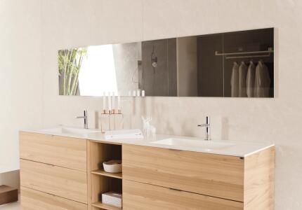 依諾巖板廠家【英格瑪】800×2600mm的規格,可搭配踢腳線,作為客廳背景墻、護墻板使用,也可實現衛浴空間的【一片到頂】,9mm的厚度,上墻足夠輕便,下地也足夠堅實。