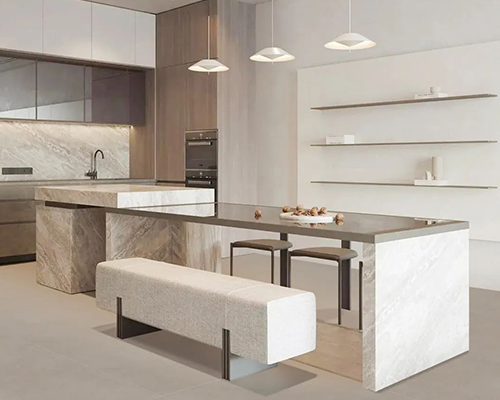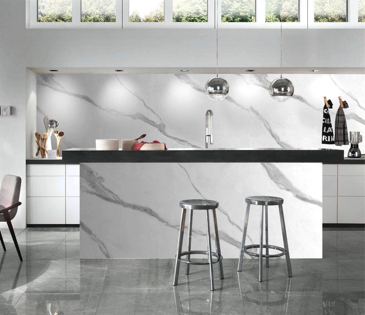 依諾巖板廠家推出白色巖板—【寒江雪】系列。好看又好用的巖板材料,6MM、12MM厚度巖板在餐桌臺面、浴室柜面板等空間應用效果圖