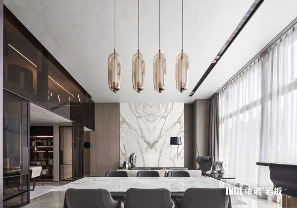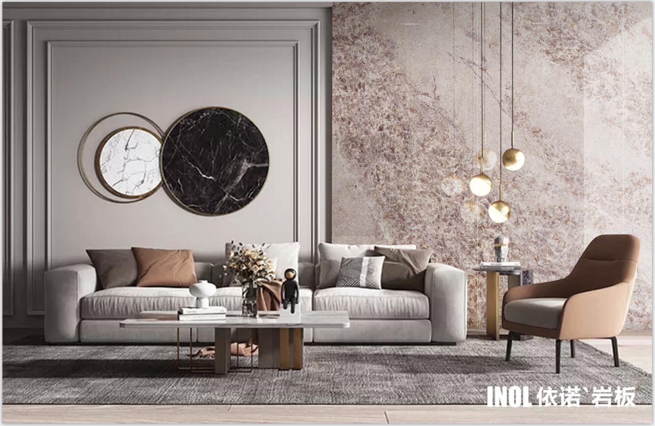 依諾巖板廠家推出【大宅系列】巖板——魚肚金。750x1500mm巖板產品全屋搭配應用方案