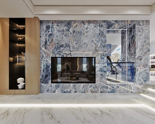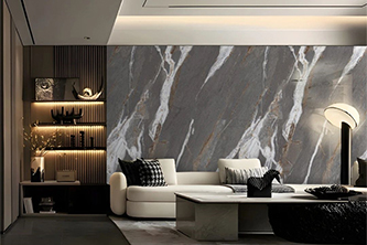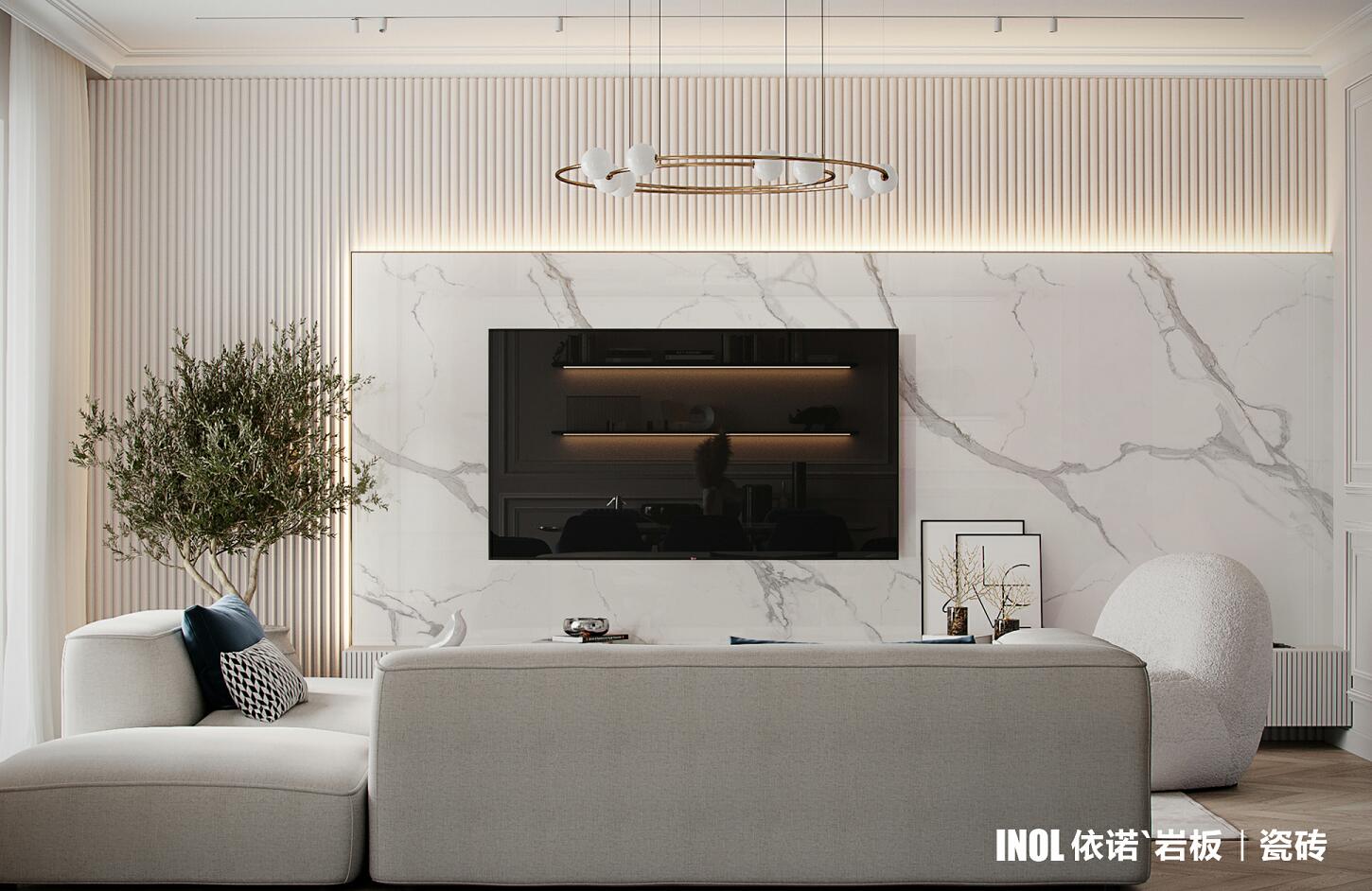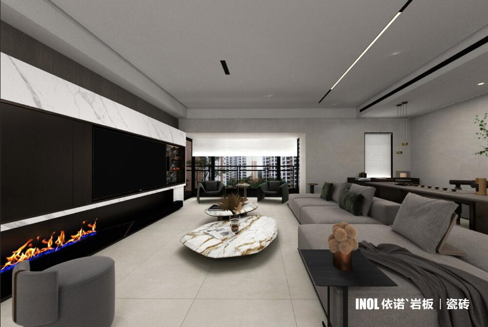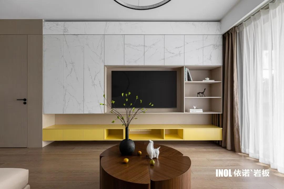 依諾巖板廠家級家居空間材料——巖板【沙弗萊】系列,在電視背景墻等空間的應用效果圖。沙弗萊系列巖板共【三種色彩】可選,以及1200x2800mm、800x2600mm兩種規格。