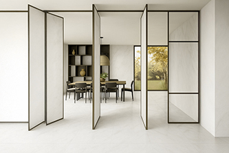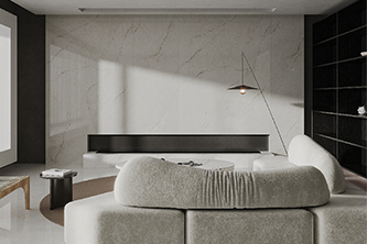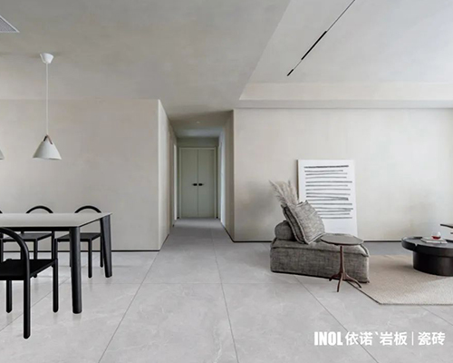 依諾巖板瓷磚新品【維多利亞白 】,750×1500mm規格,中小戶型友好/大空間適配,可通過同一方向任意拼接實現無限延展。