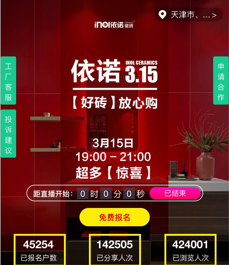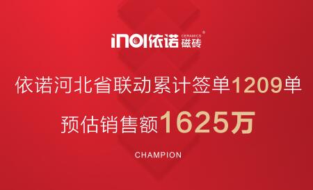 2016年3月27日,依諾磁磚爆破營銷活動在武漢、襄陽、鄭州、徐州、上海、樂山、重慶、瀘西縣、大連、沈陽、唐山、天津12個城市落下帷幕,活動最終以1天1764單的非凡業績,向行業彰顯了依諾磁磚的品牌魅力和影響力。