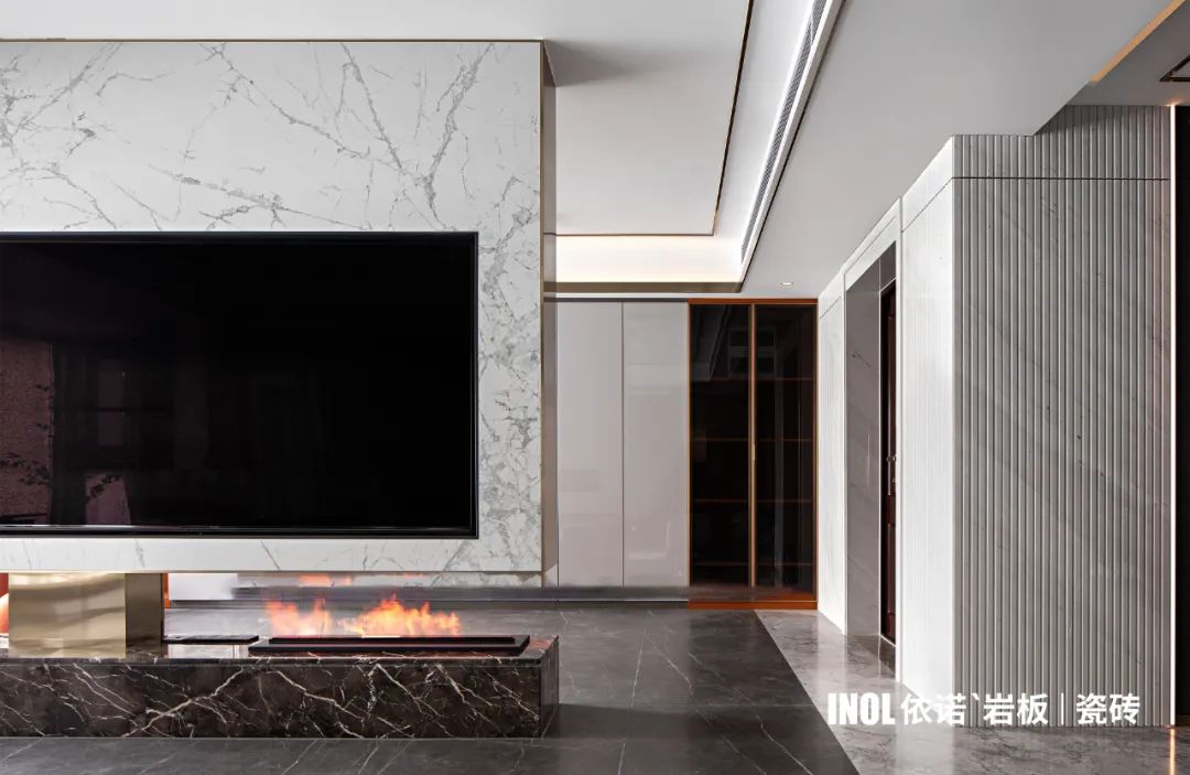 廣東佛山·凱麗山莊,600㎡現代奢宅,全屋選用地磚、背景墻、衛生間瓷磚選用依諾巖板瓷磚。